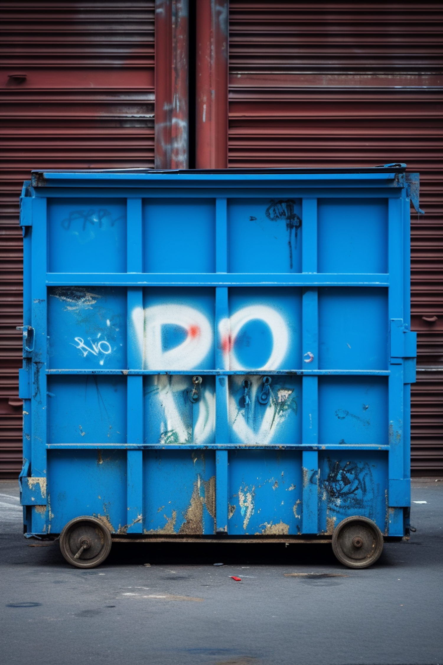 Urban Decay and Graffiti - Blue Dumpster Against Red Shutter