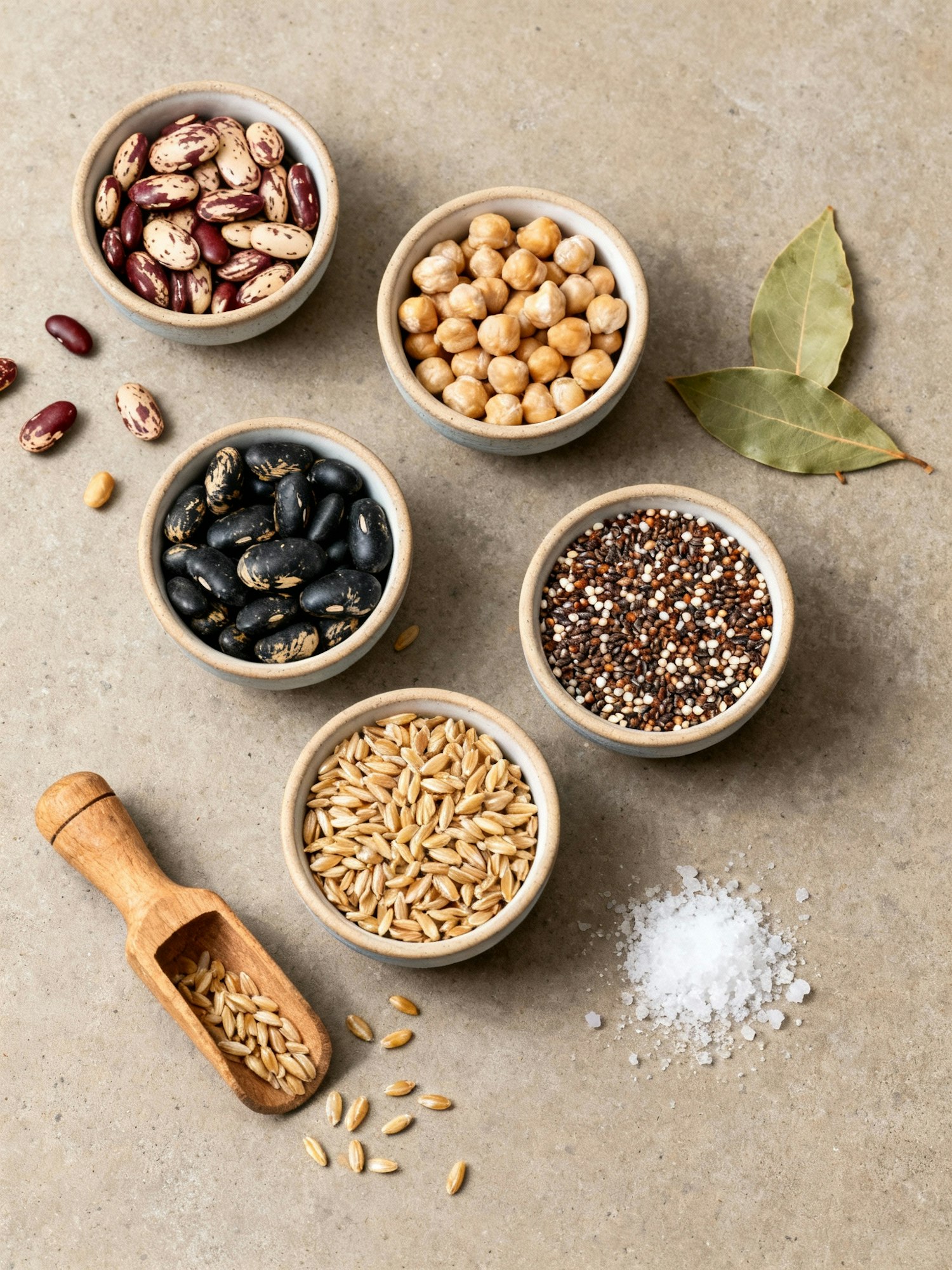 Ultra-real overhead arrangement of small ceramic bowls with heirloom beans (borlotti, black turtle, chickpeas) and grains (farro, quinoa), a wooden scoop, bay leaves, and measured pinches of salt; a few scattered kernels. Soft overhead source (~5600K) through 6×6′ diffusion, perimeter flags; 60–65 mm at f/8; ISO 100. Angle: true 90°. Surface: matte pale concrete. Color: clean neutrals with muted browns. Negative: perfect grid symmetry, fake spills, heavy contrast, color cast, logos, watermarks.