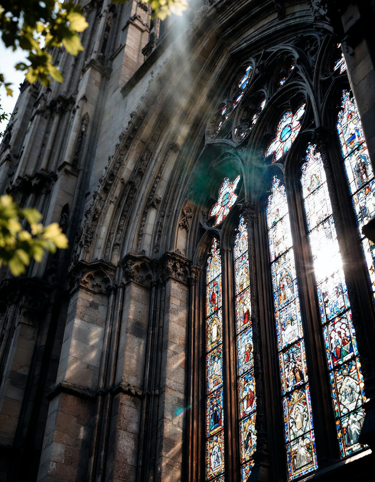 Gothic cathedral with stunning stained glass windows and sunlight streaming through, casting colorful patterns on the stone facade.