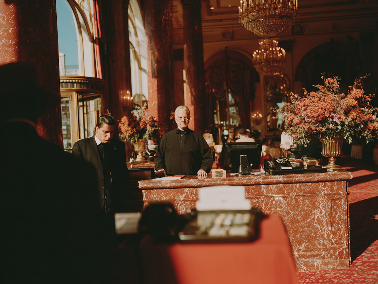 Elegant hotel lobby with marble decor, floral arrangements, and chandeliers, featuring staff in formal attire at the reception desk.
