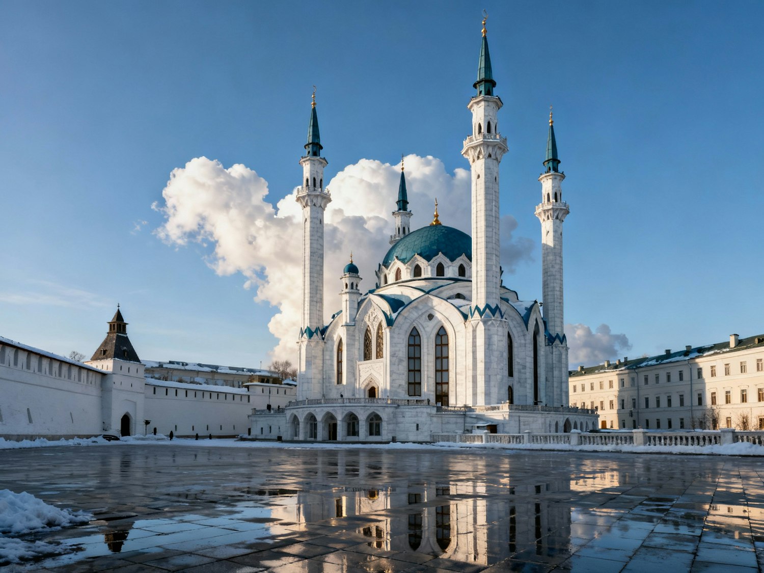 Kazan, Russia — Kul Sharif Mosque within the Kazan Kremlin just after a winter storm; late-afternoon raking light from camera-left (~35°); neutral-cool 5200–5400 K; white marble domes glowing; wet stone courtyard with subtle, realistic reflections; cumulus lifting behind minarets; atmosphere clear and calm. 24 mm, f/7.1, ISO 100, 1/250 s; circular polarizer to deepen sky and manage marble glare—rotate lightly to avoid rainbow banding. Negative: golden tint, HDR glow, halo edges, mirror-polished reflections, oversharpening.