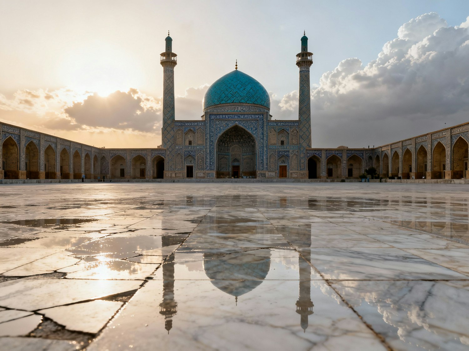 Isfahan, Iran — Naqsh-e Jahan Square after rain; cumulus clearing over the Shah Mosque dome; late-afternoon sun from camera-left (~35°); neutral-warm 5400–5700 K; wet marble courtyard with soft broken reflections; blue-tile minarets shimmer; atmosphere calm and luminous. 24 mm, f/7.1, ISO 100, 1/250 s; CPL to enrich sky and control glare — avoid rainbow banding. Negative: over-saturated turquoise, HDR contrast, halo edges, gray haze.