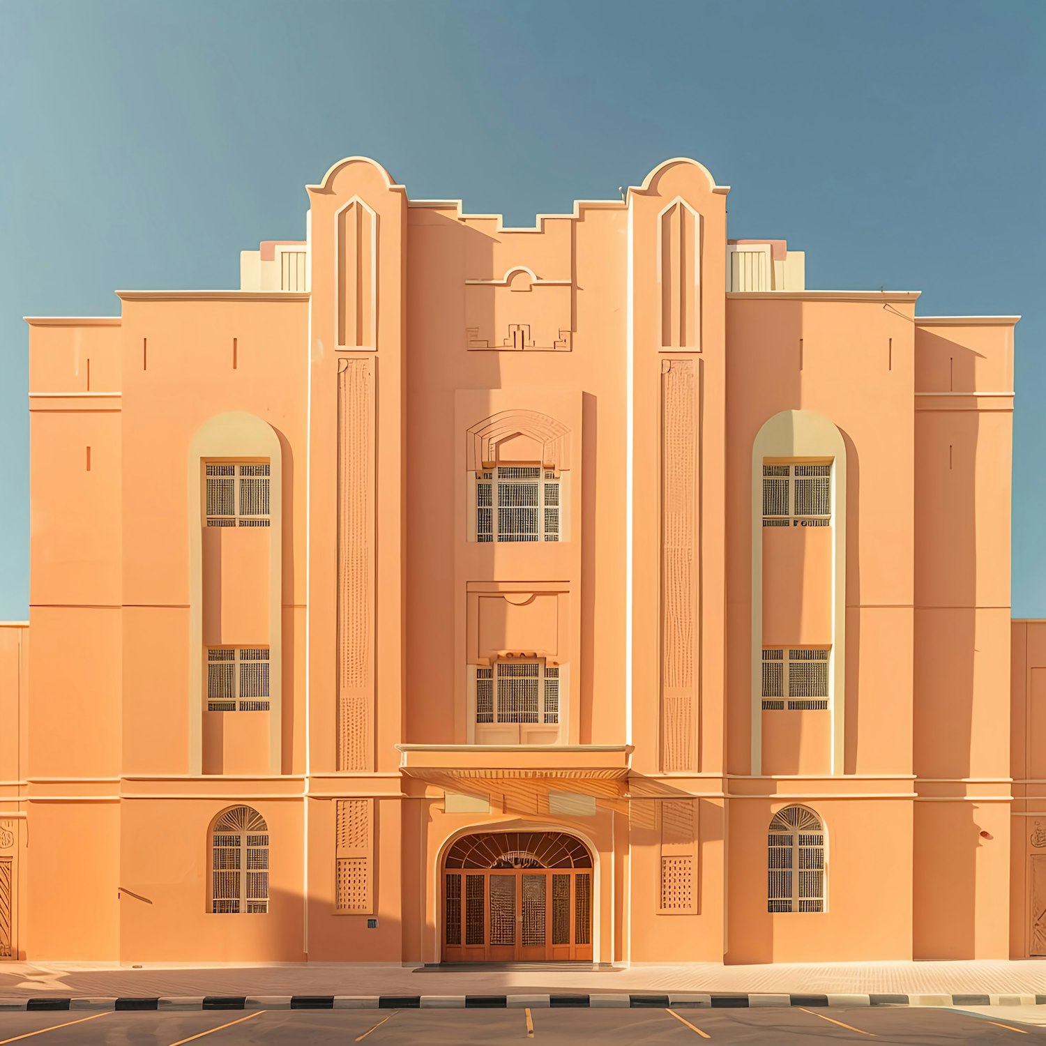 Elegant Art Deco building with peach facade, arched windows, and intricate patterns under a clear blue sky. Symmetrical and grand design.