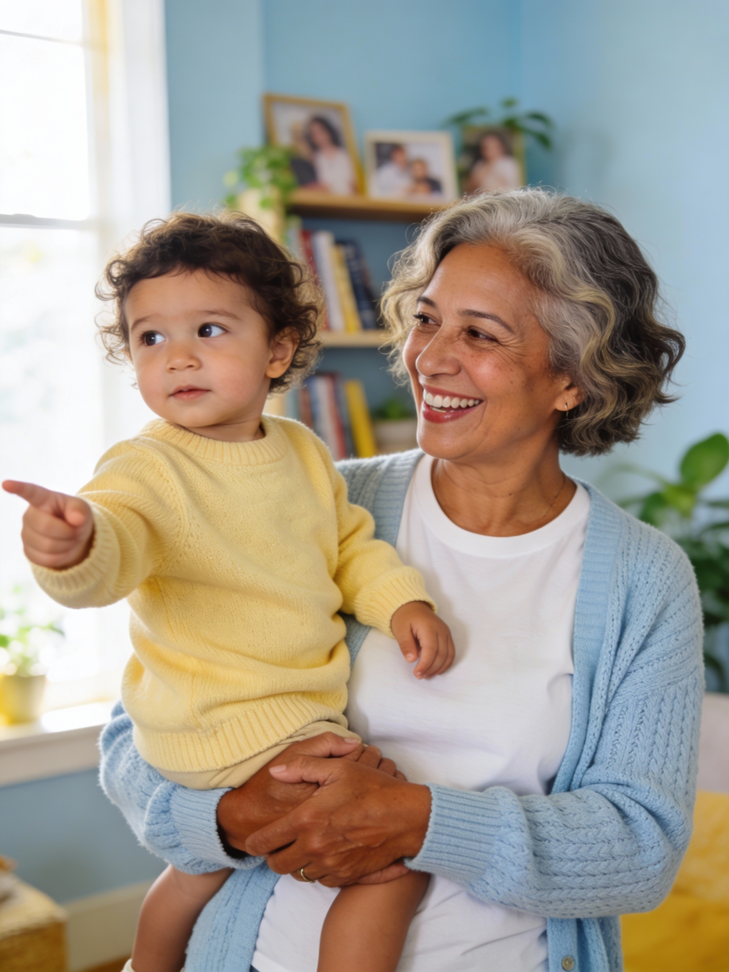 Studio portrait at home of a Brazilian female grandmother caregiver in her late 60s holding a toddler on her hip; medium tan skin, warm undertone; short gray hair, softly waved; soft light blue knit cardigan over a white t-shirt, no logos; toddler around 2 years old sitting on her hip, only the upper body and arms visible, wearing a pastel yellow sweater. Warm natural daylight from a nearby window; shallow depth of field; background is a blurred cozy home interior with a bookshelf, family photos and green plants, soft bokeh. The grandmother turns her head toward the toddler and gives a big, genuine grin with visible laugh lines, not looking at the camera; the toddler looks off to the side, one hand pointing or reaching toward something out of frame. Portrait orientation, 3:4 ratio, mid-chest-up composition; subject centered, camera at eye level; full head and hair inside the frame with a little space above; both shoulders and the toddler clearly visible.