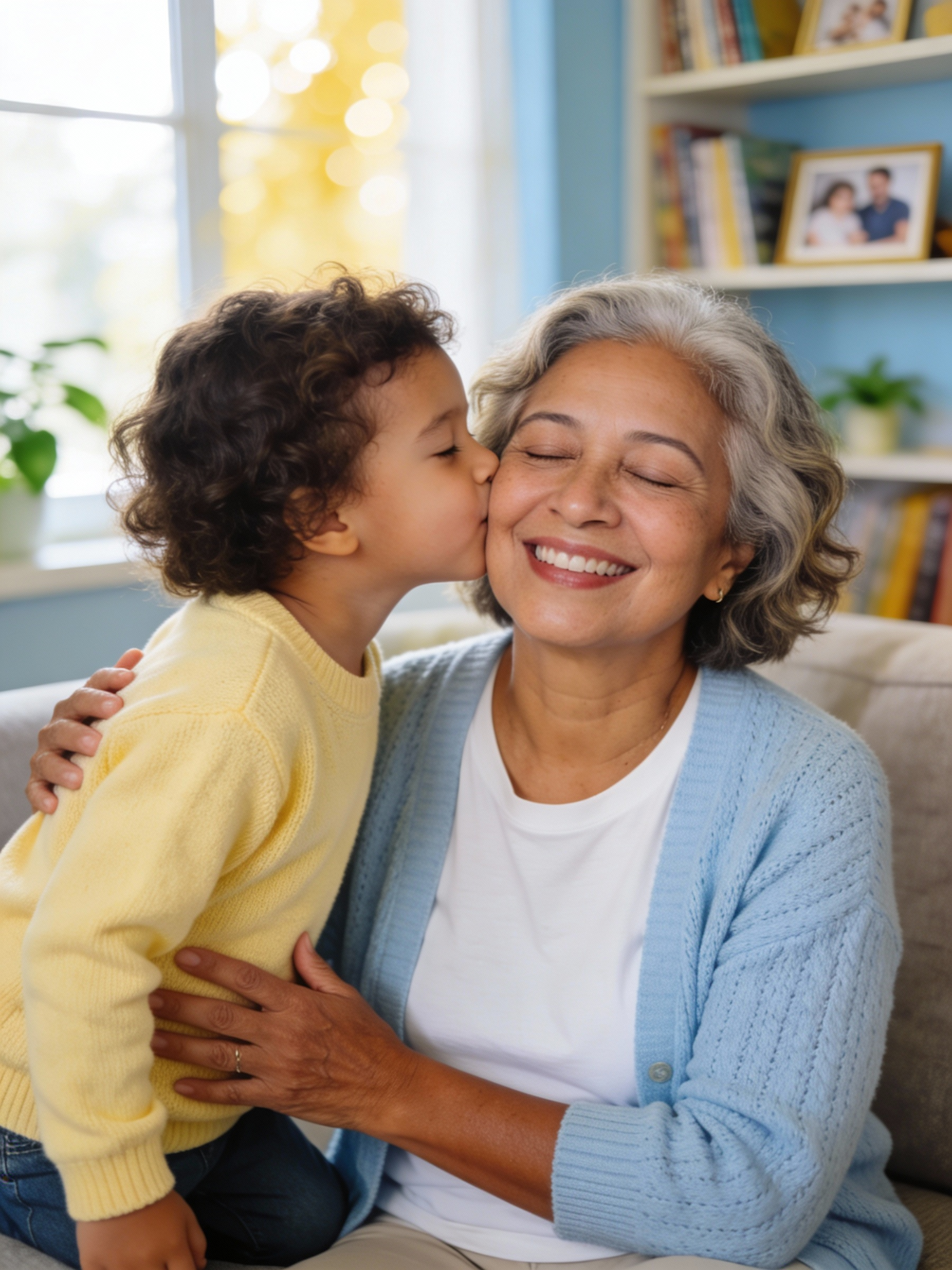 Studio portrait at home of a Brazilian female grandmother caregiver in her late 60s sharing a tender moment with a toddler; medium tan skin, warm undertone; short gray hair, softly waved; soft light blue knit cardigan over a white t-shirt, no logos. She sits on a sofa facing slightly toward the camera while her 2-year-old grandchild in a pastel yellow sweater kneels beside her, only the upper body visible, leaning in to give her a small kiss on the cheek. Warm natural daylight from a window; shallow depth of field; background is a blurred living room with a bookshelf, framed family photos and plants, soft bokeh. The grandmother closes her eyes and smiles broadly, enjoying the kiss, one hand gently resting on the child’s back; the toddler’s face is pressed gently to her cheek, eyes half-closed in concentration. Portrait orientation, 3:4 ratio, mid-chest-up composition; subjects centered, camera at eye level; full head and hair of the grandmother and the child’s head fully inside the frame with a little space above; both shoulders and the child’s arm clearly visible, no cropping at the top or sides.