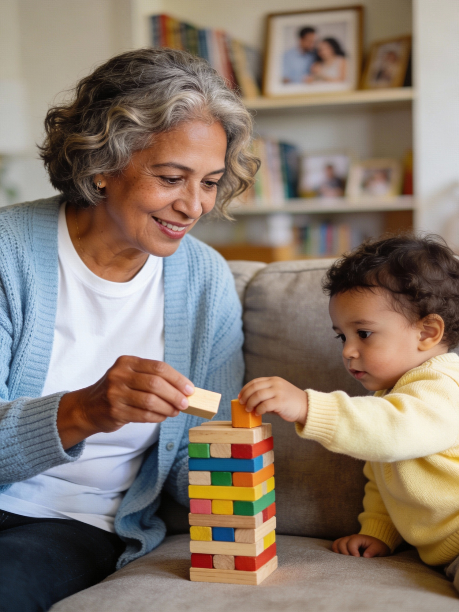 Studio portrait at home of a Brazilian female grandmother caregiver in her late 60s playing with a toddler; medium tan skin, warm undertone; short gray hair, softly waved; soft light blue knit cardigan over a white t-shirt, no logos. She sits on a sofa, turned slightly toward the toddler around 2 years old who stands or kneels on the cushion beside her, only the upper body visible, wearing a pastel yellow sweater. Between them, on the sofa seat at chest height, is a small stack of colorful wooden blocks; the grandmother holds one block and is about to place it on the tower while the toddler reaches for another block. Warm natural daylight from a window; shallow depth of field; background is a blurred living room with a bookshelf and framed family photos, soft bokeh. The grandmother looks at the tower with a focused but smiling expression; the toddler looks at the block in their own hand with intense concentration. Portrait orientation, 3:4 ratio, mid-chest-up composition; both centered, camera at eye level; full head and hair of the grandmother inside the frame with a little space above; child’s head and blocks clearly visible, no cropping at the top or sides.