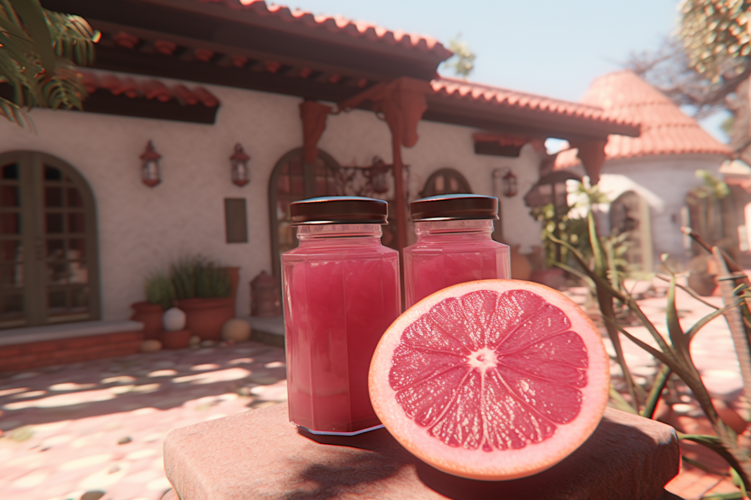 Vibrant pink grapefruit juice in jars with a halved grapefruit, set against a Mediterranean-style building in warm sunlight.