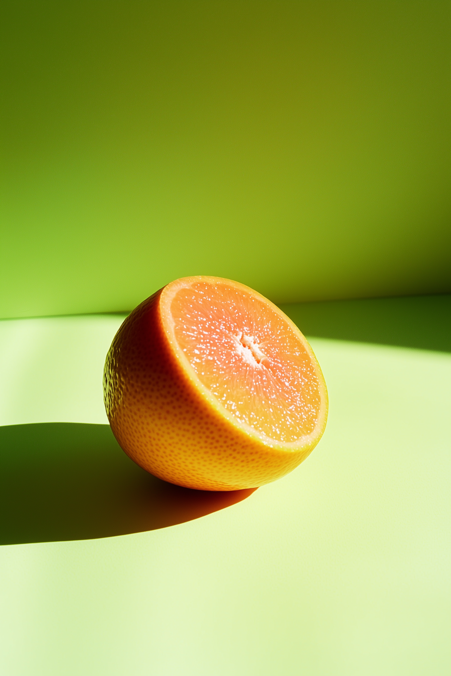 A halved orange on a lime green background, showcasing vibrant colors and fresh textures in bright lighting.