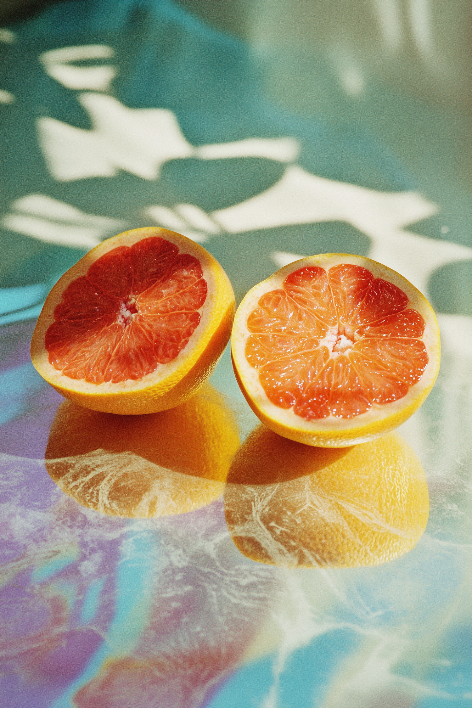 Vibrant grapefruit halves on a reflective surface with iridescent hues, creating a fresh and dreamy visual effect.