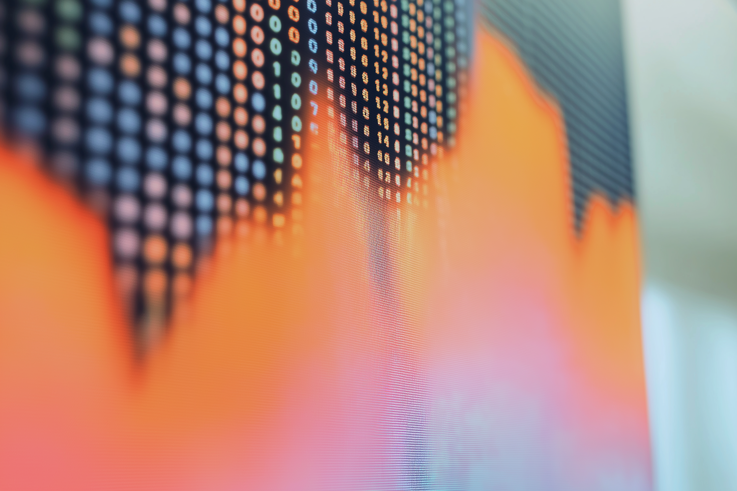 Close-up of a digital screen showing a downward-trending graph with pixelated details in orange and red tones, perfect for data visuals.