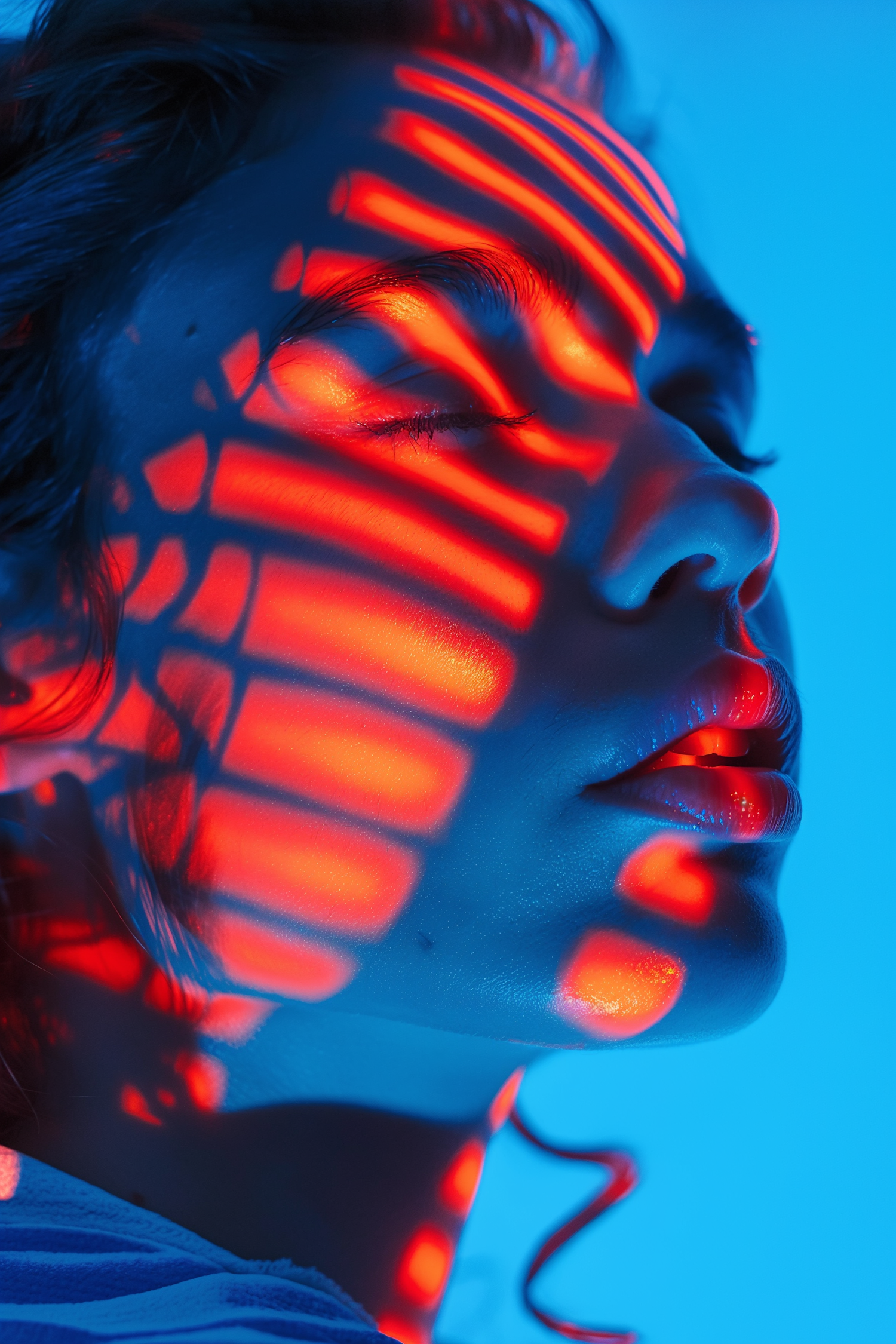 Close-up of a face with red and blue lighting, creating dramatic patterns and a futuristic look.