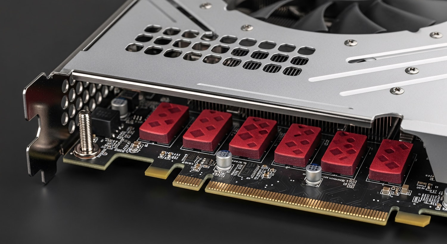 Close-up of a modern graphics card with a silver casing, red heat sinks, and visible electronic components, highlighting its detailed design.
