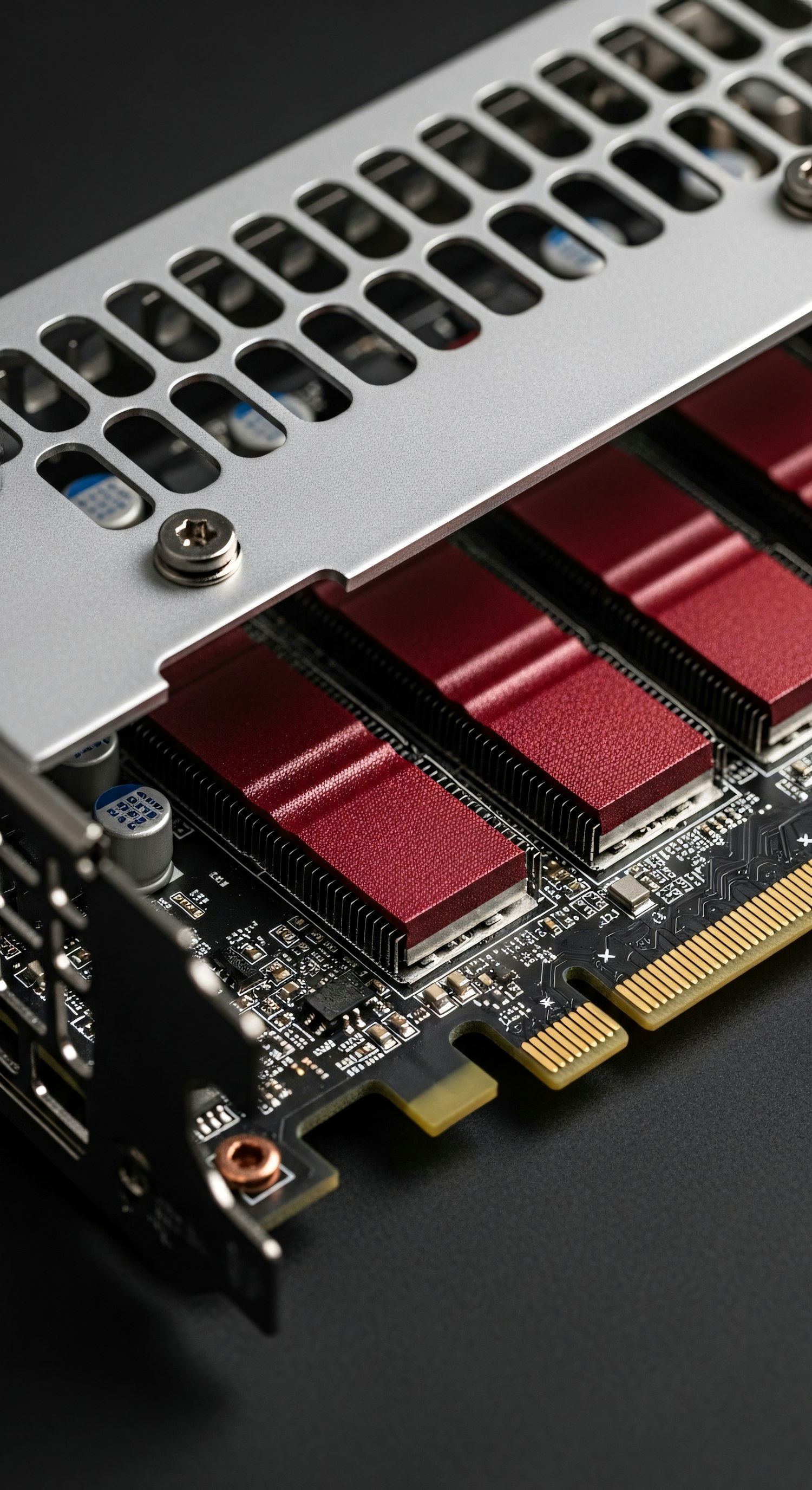 Close-up of a computer graphics card with red heat sinks, metallic casing, and detailed circuitry, showcasing its intricate design.
