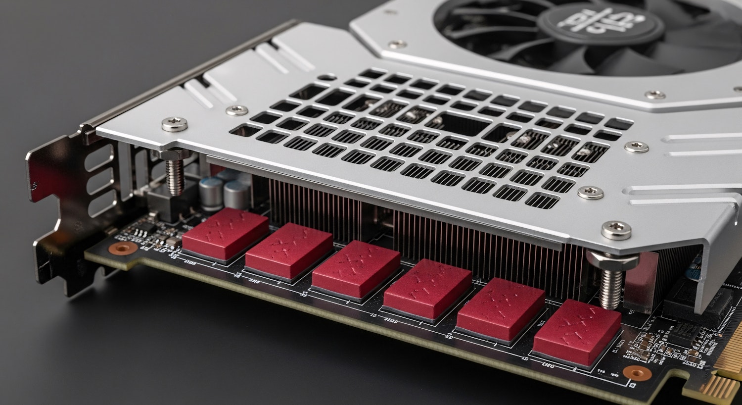 Close-up of a graphics card with a silver heatsink, cooling fan, and red memory heat spreaders, showcasing its detailed design and components.