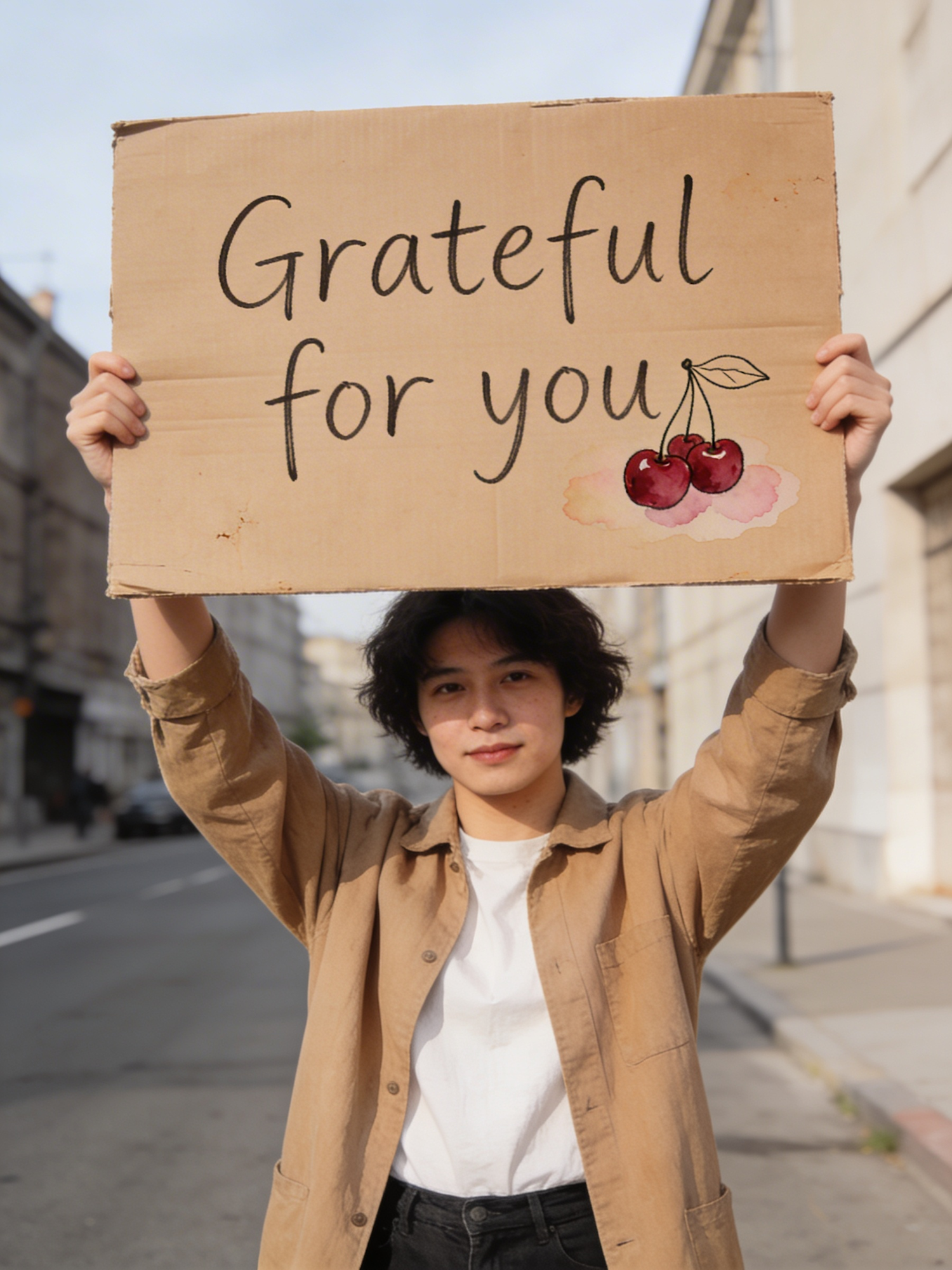 A person holding a sign reading 'Grateful for you' with cherries, standing on a sunny street, wearing a beige jacket and white shirt.