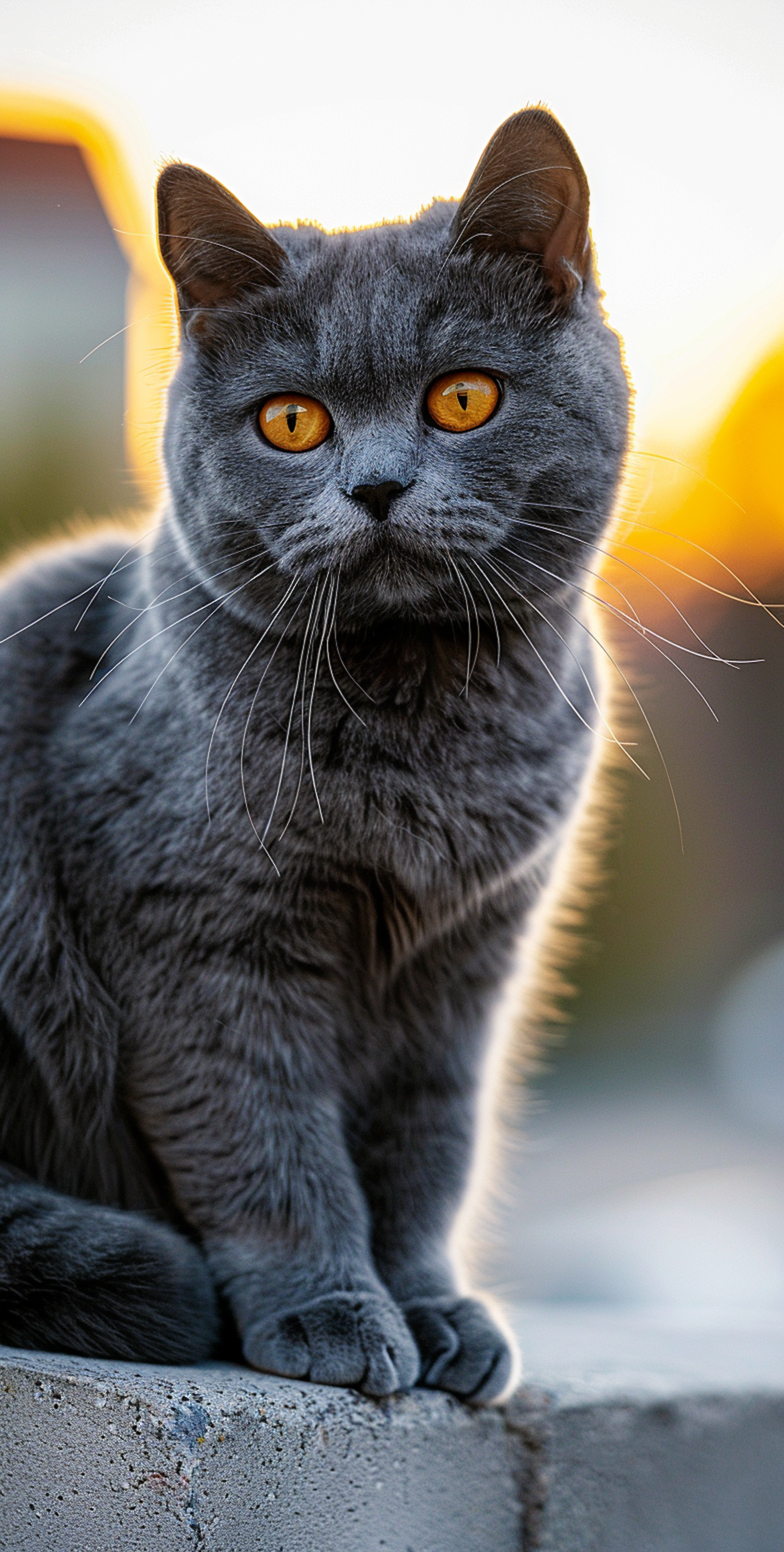 Elegant gray cat with amber eyes sitting on a ledge at sunset, highlighted by warm, glowing light.
