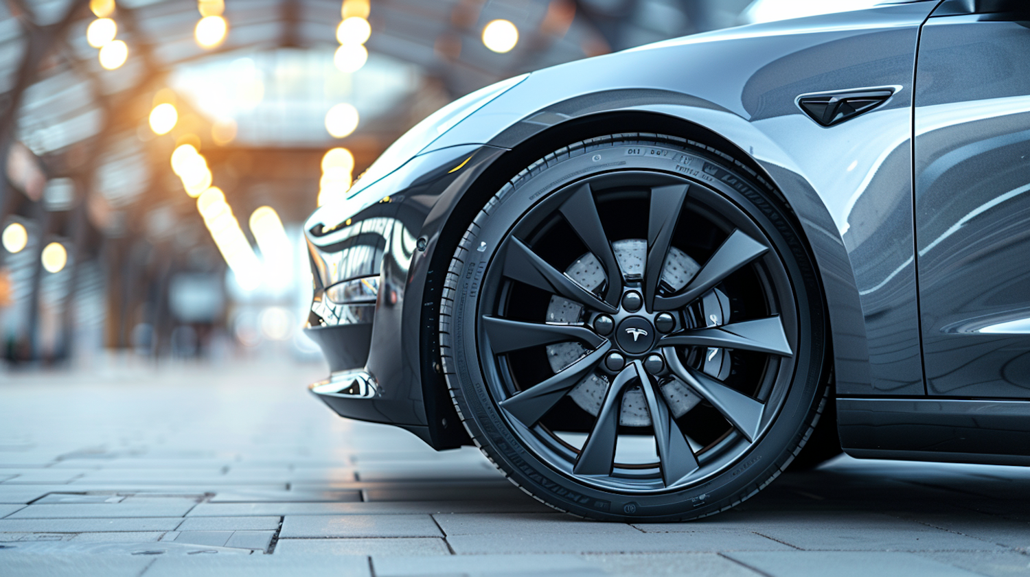 Close-up of a sleek silver car's wheel with a matte finish, set against a blurred background with warm bokeh lights.