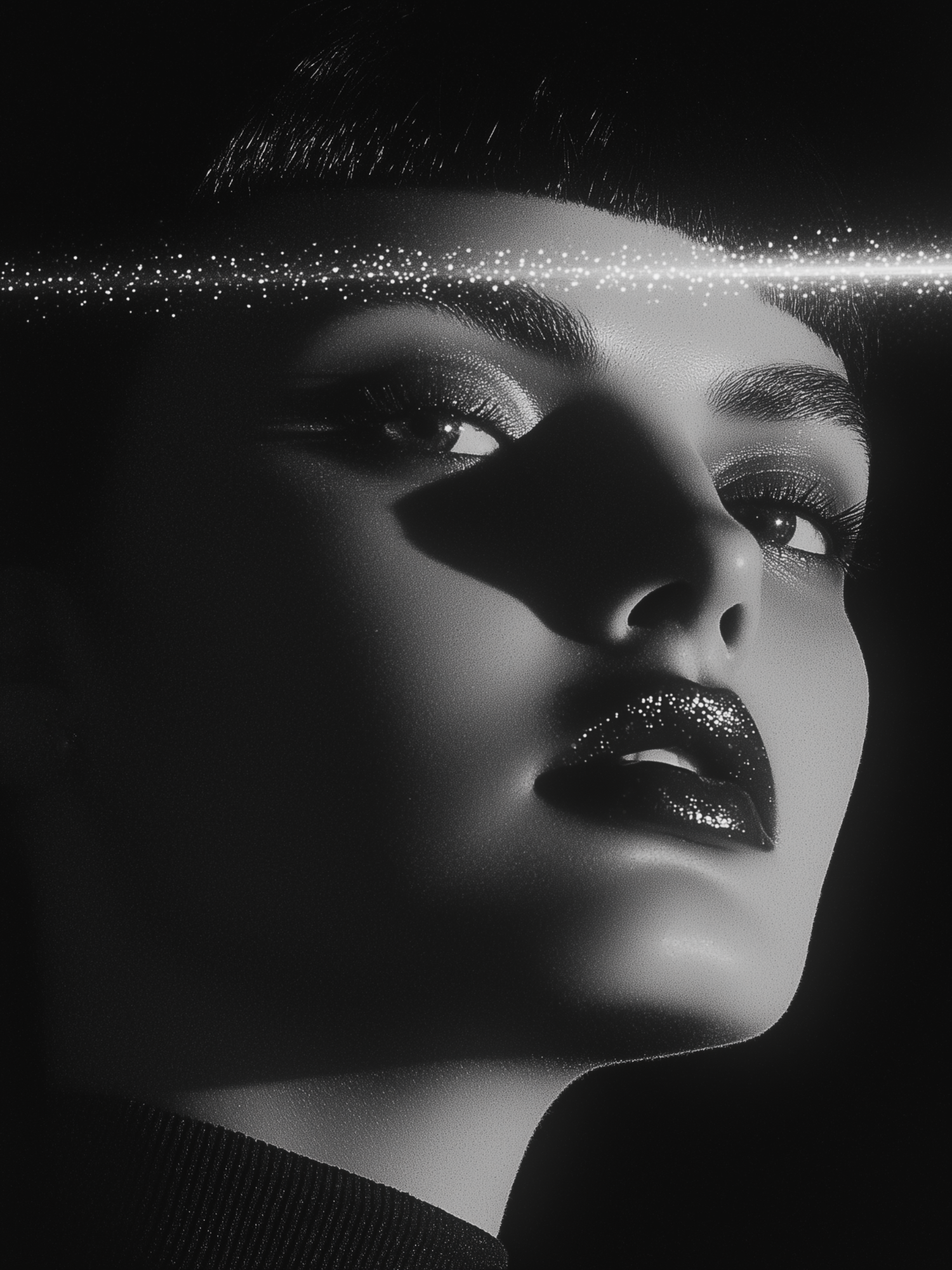 Black and white portrait with glossy lips and sparkling light, creating a futuristic and artistic look.