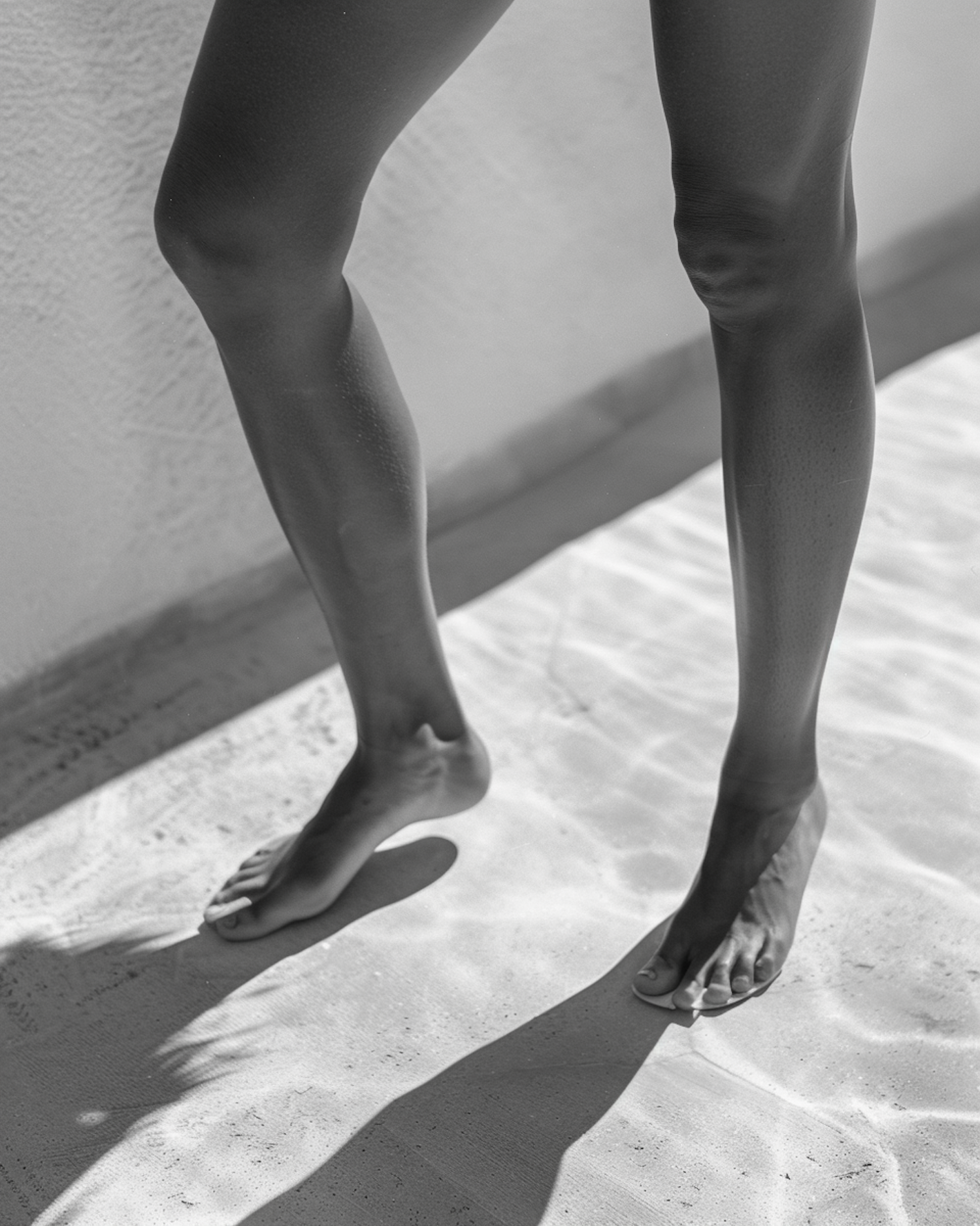 Black and white photo of bare legs and feet casting shadows on a textured surface, highlighting light and shadow play.