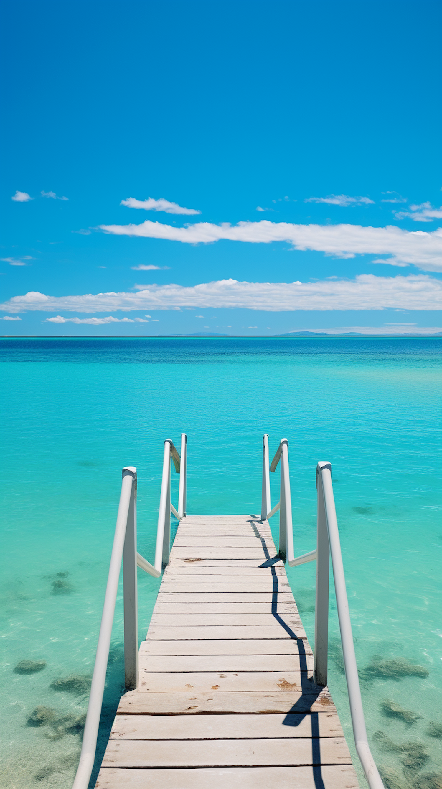 Wooden pier leading into turquoise waters under a clear blue sky with fluffy clouds, creating a serene and inviting scene.