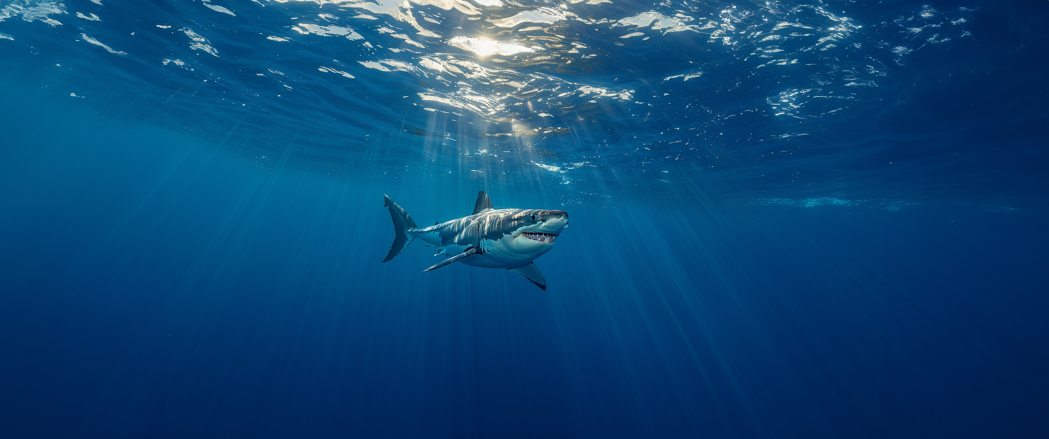 Majestic great white shark swimming in deep blue ocean with sunlight filtering through water, showcasing its powerful presence.