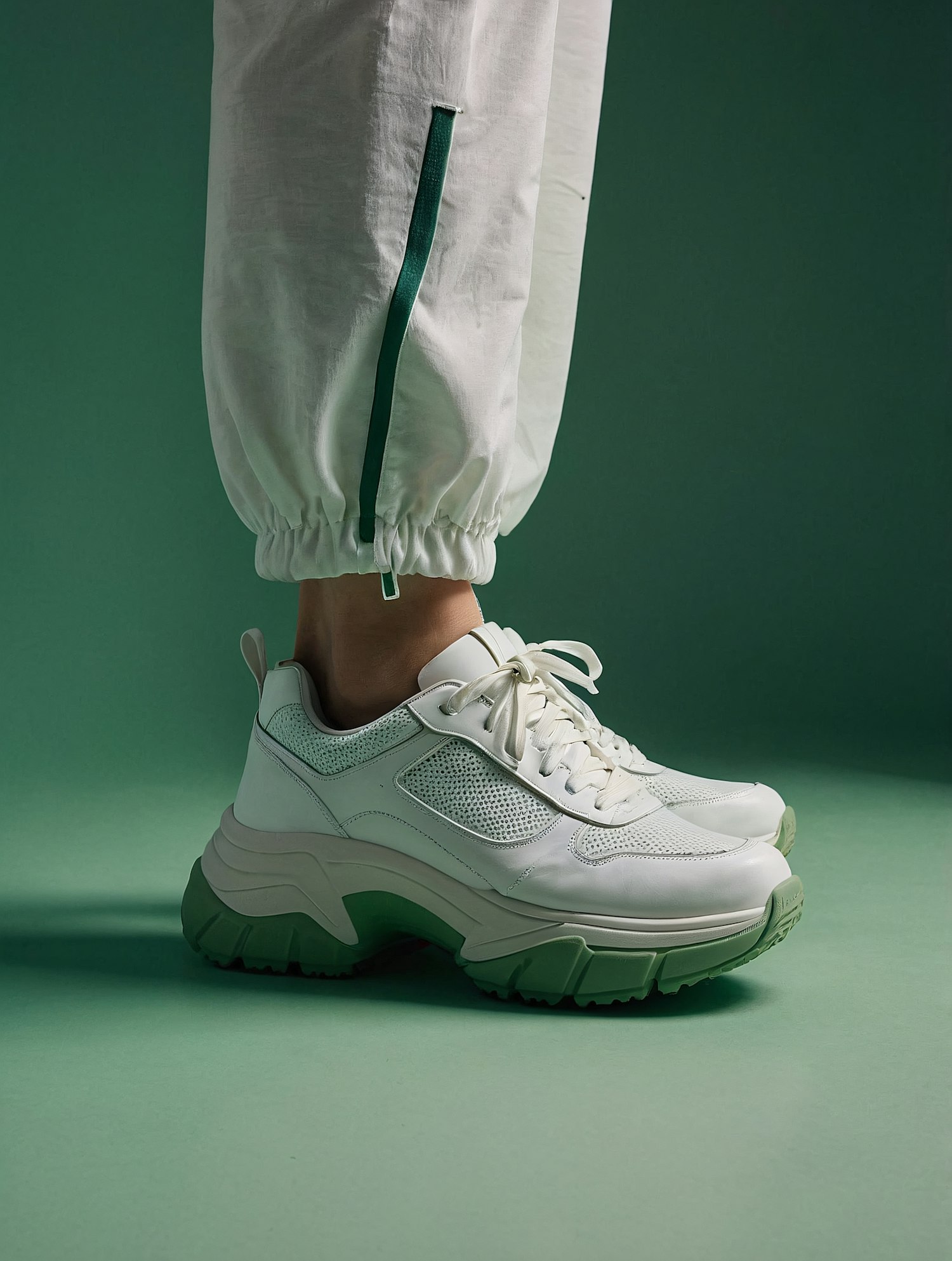 Stylish white chunky sneakers with green soles paired with white joggers featuring a green zipper detail, set against a green backdrop.