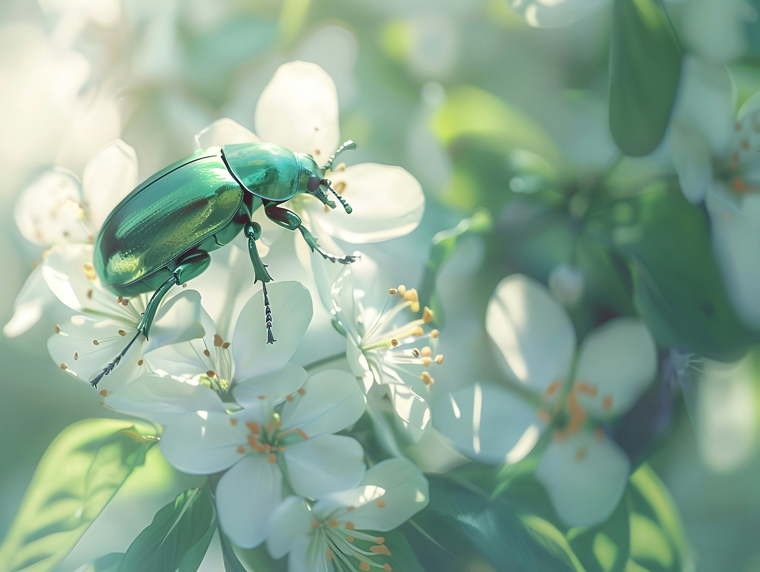 A metallic green beetle on white flowers, set against a soft, blurred garden background, creating a serene and natural scene.