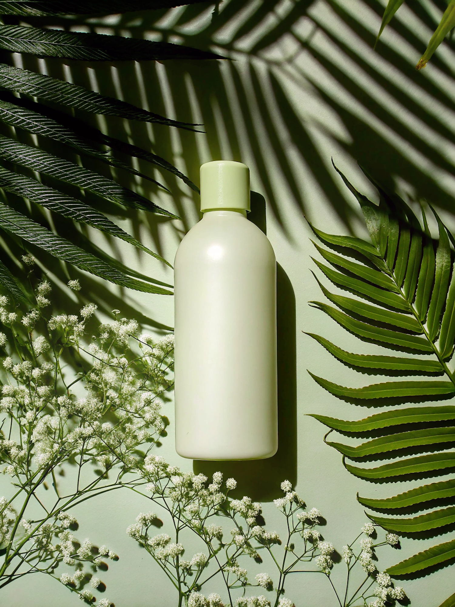 Minimalist white bottle with green cap surrounded by ferns, baby's breath flowers, and palm shadows on a pastel green background.
