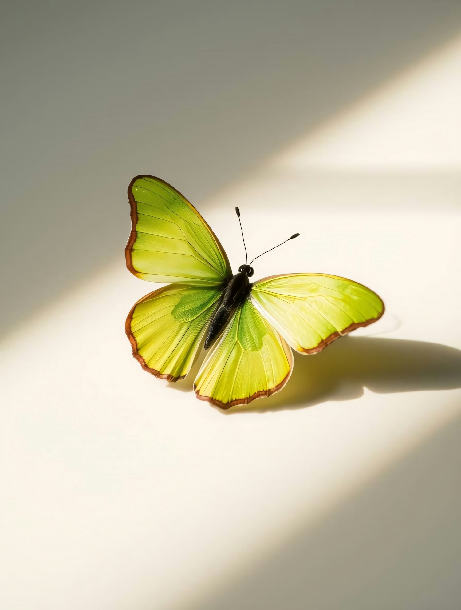 A stunning green butterfly with translucent wings and brown edges rests on a sunlit surface, casting a delicate shadow.