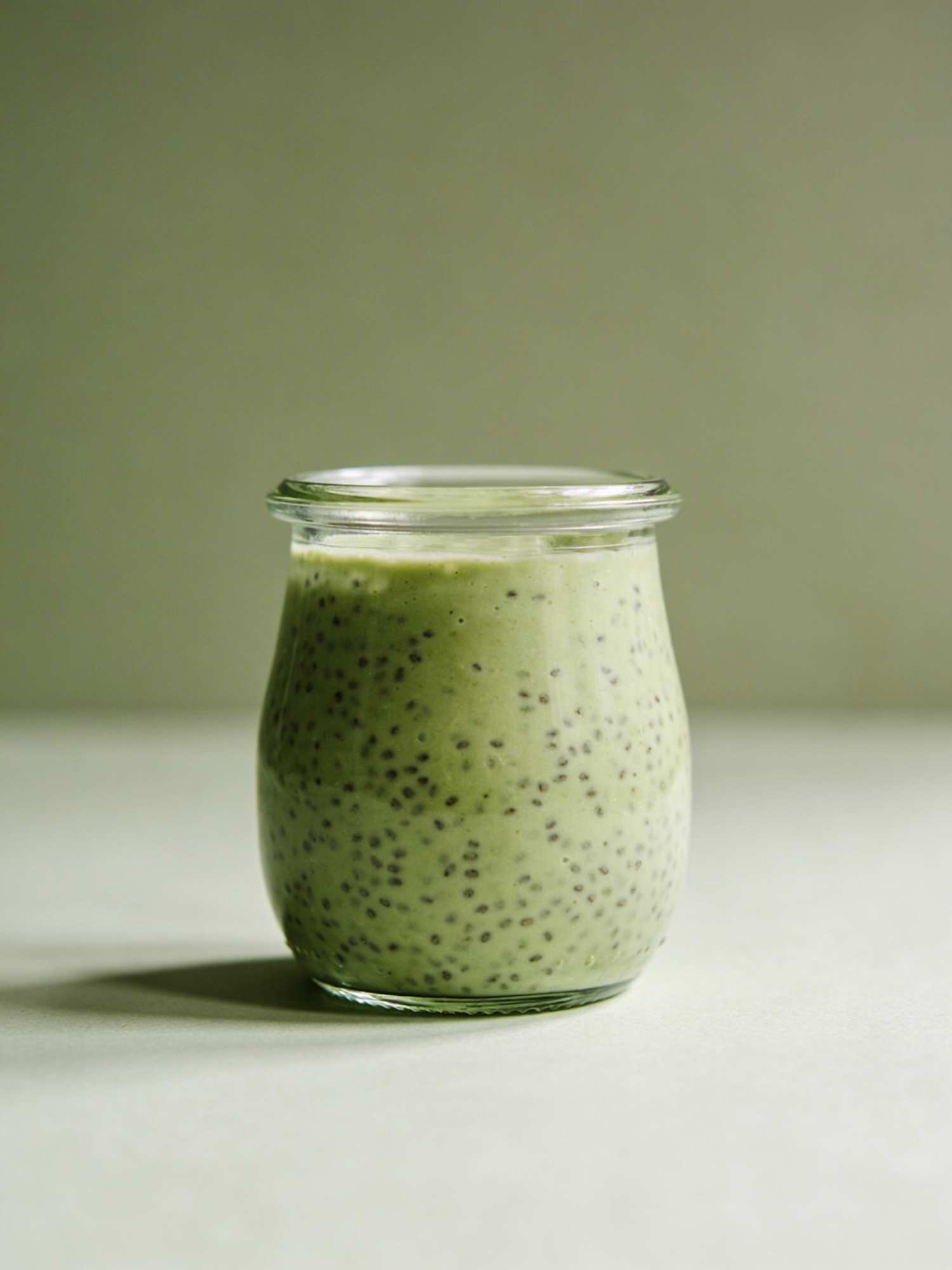 A glass jar filled with soft green matcha chia pudding against a muted sage backdrop. Smooth matte lighting, Scandinavian calm, sculptural minimalism.
