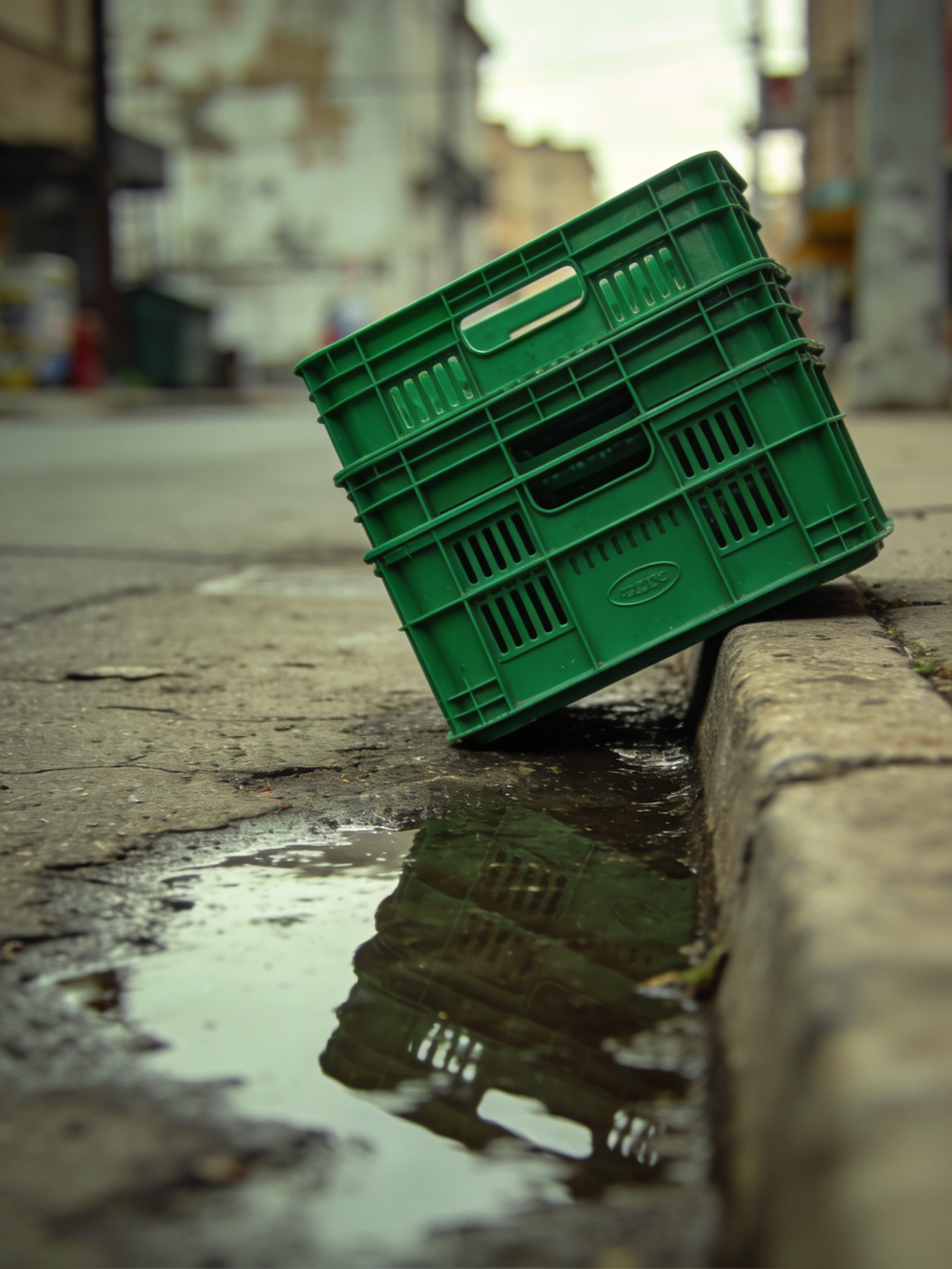 Cinematic street photography, realistic city textures, muted surroundings with green as hero color, soft daylight, gentle film grain, subtle halation, shallow depth of field, 50mm lens look. Angled shot of green plastic crates stacked near a curb, puddles reflecting their color, street surface worn and damp, calm everyday atmosphere. No logos, no readable text, no brand names.