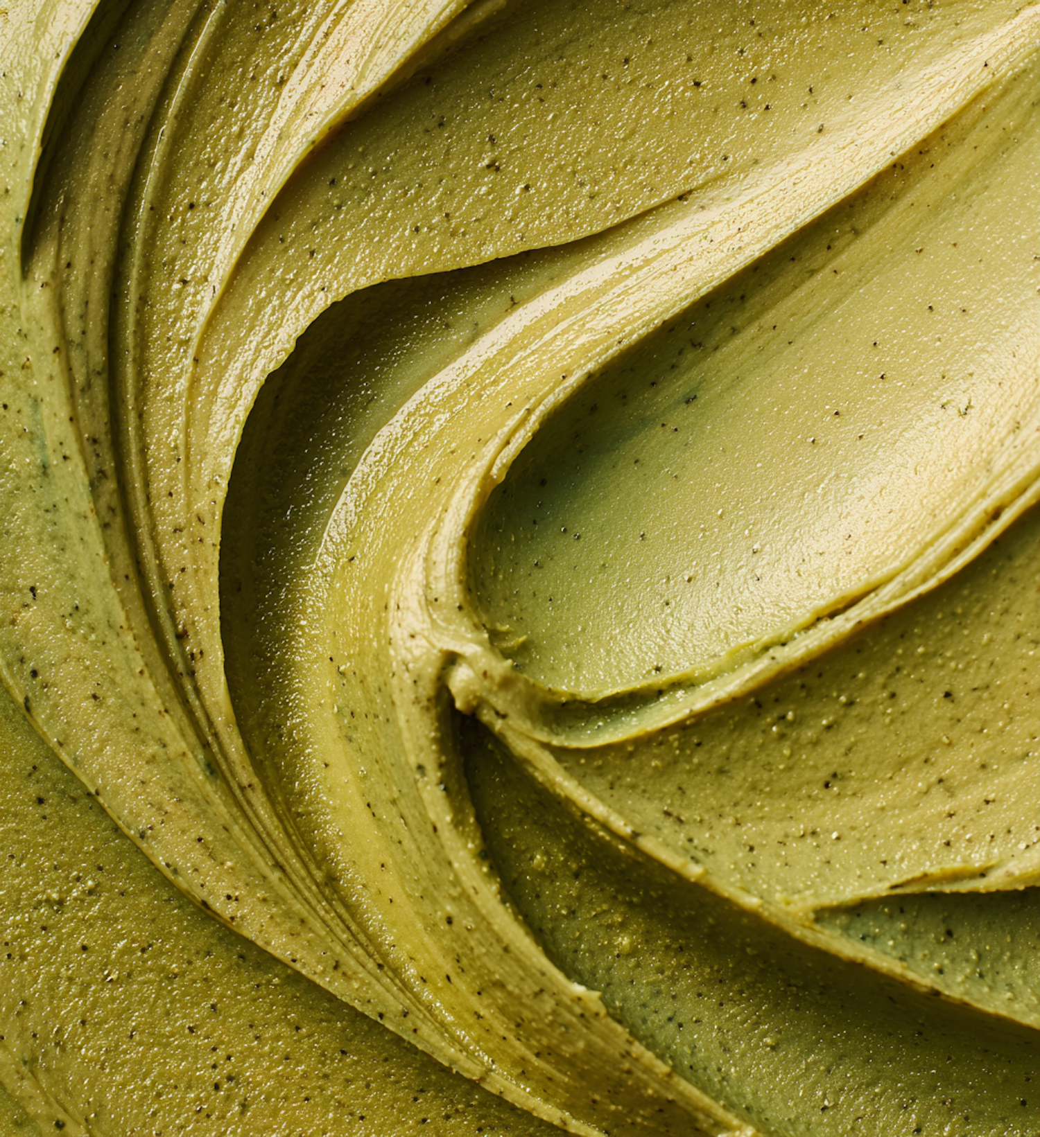 Close-up of a smooth, green textured cream or spread with a glossy finish and artistic swirls, showcasing its rich and creamy consistency.