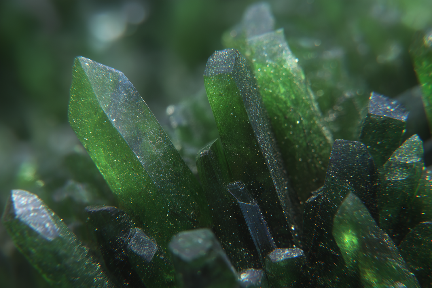 Vivid green crystals with light refracting off their gleaming surfaces in vivid detail against a mildly blurred background.