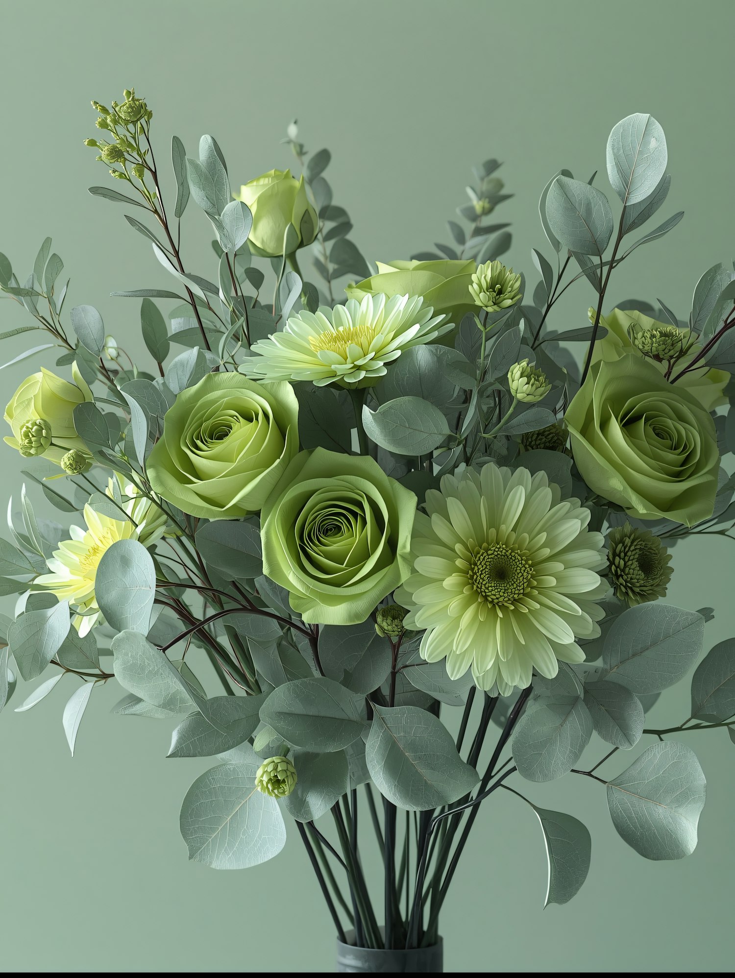A stunning green floral arrangement featuring roses and daisies with eucalyptus leaves, set against a matching green background.