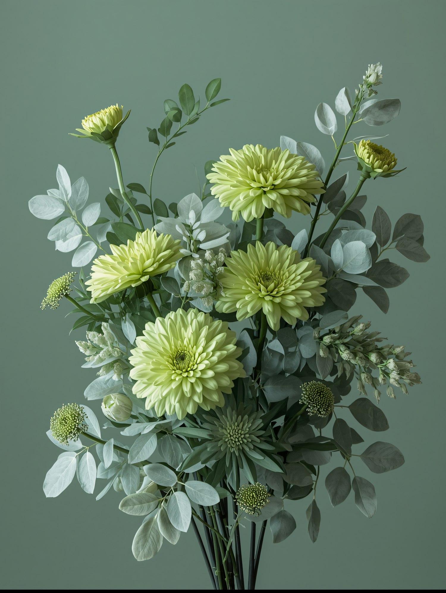 A stunning green floral arrangement with chrysanthemums and eucalyptus leaves, set against a muted green background for a serene look.