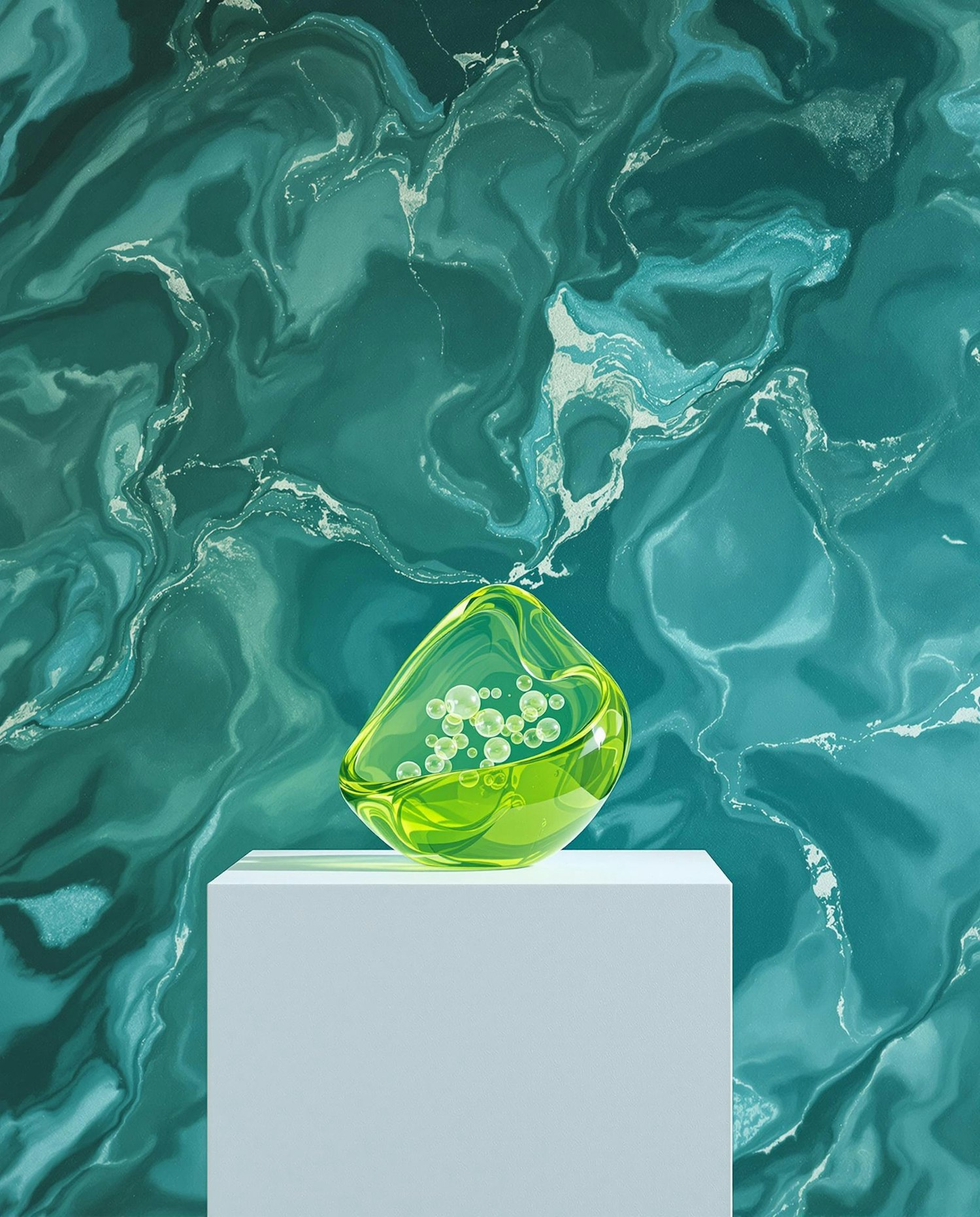 A green glass sculpture with bubbles on a white pedestal, set against a teal marbled background for a modern artistic vibe.