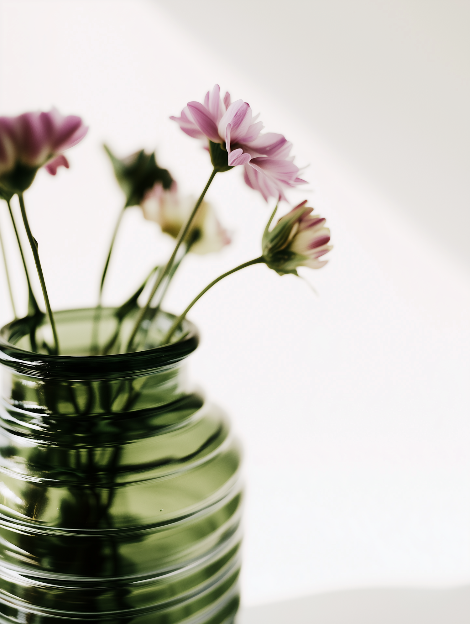 Elegant pink flowers in a ribbed green glass vase against a soft, blurred background.