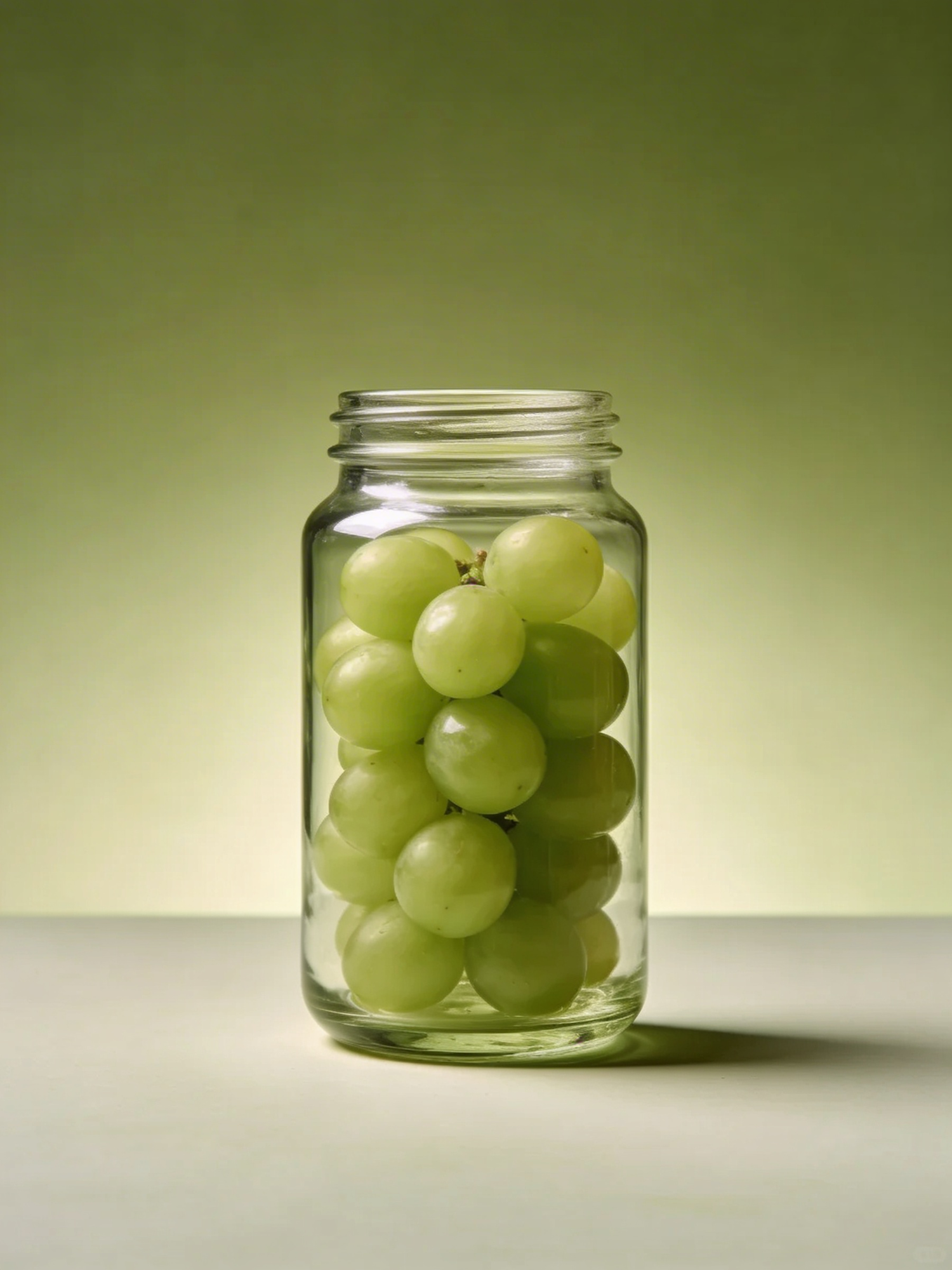 A refined still‑life of green grapes inside a glass jar, placed against a soft olive‑green backdrop. Smooth gradients, clean symmetry, quiet‑luxury Scandinavian aesthetic, medium‑format realism, no text.