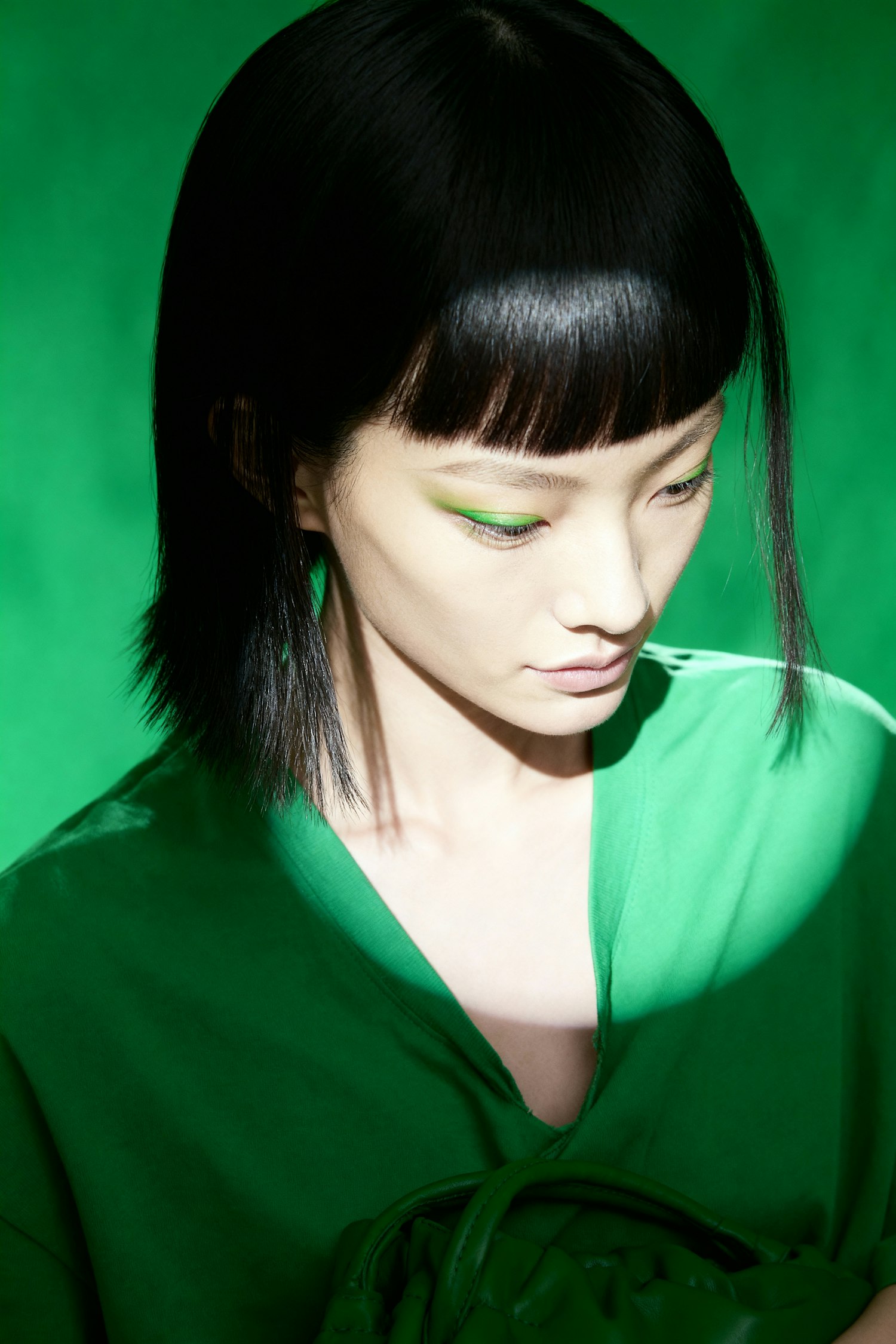 A person with black hair and green eyeshadow, wearing a green top, is set against a vibrant green background with dramatic lighting.