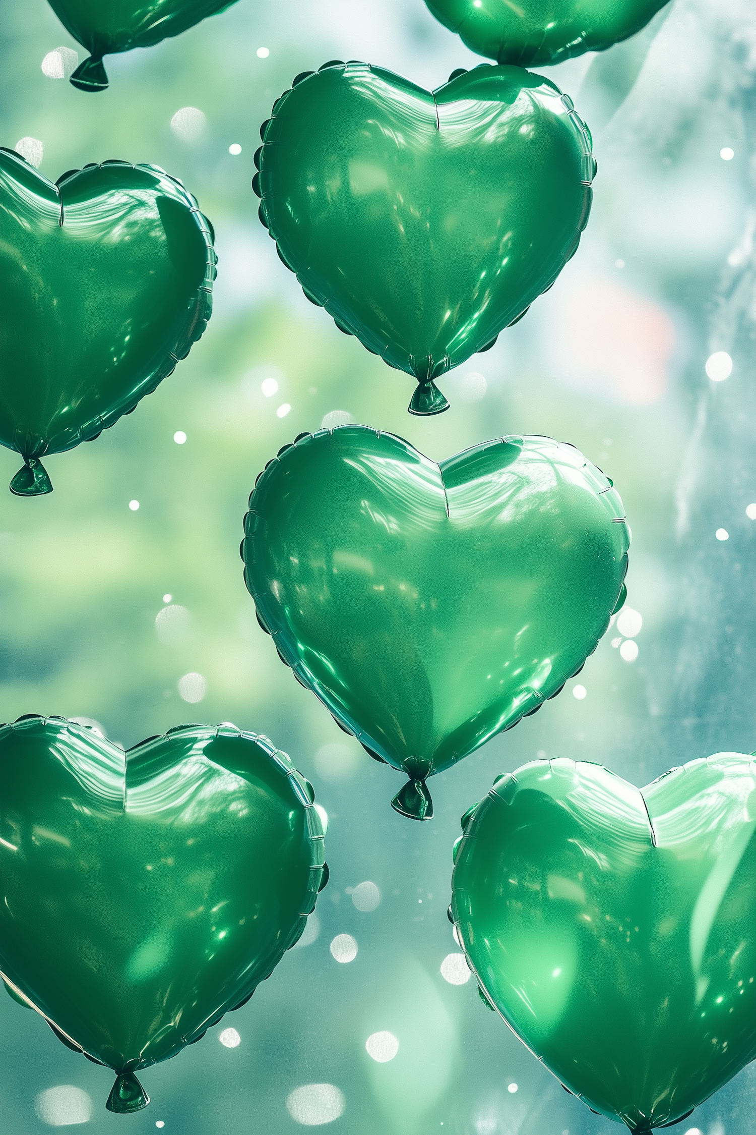 Glossy green heart-shaped balloons floating with a dreamy bokeh background, perfect for celebrations or romantic themes.