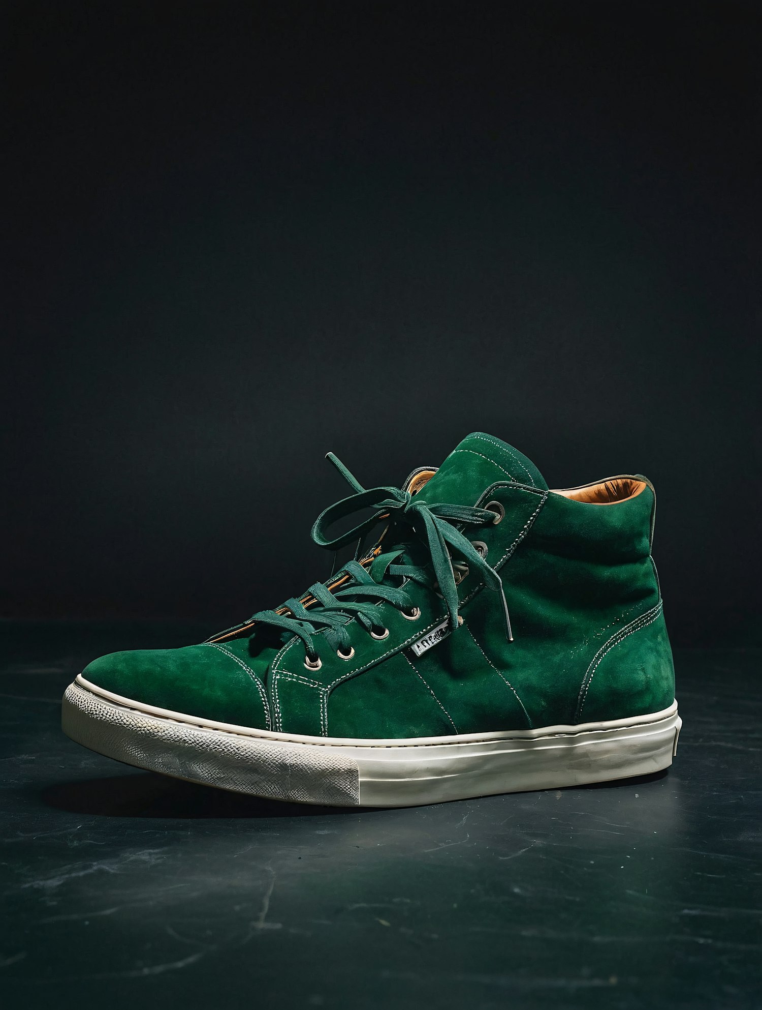 Stylish green suede high-top sneaker with off-white sole and tan lining, set against a dark background for a modern look.