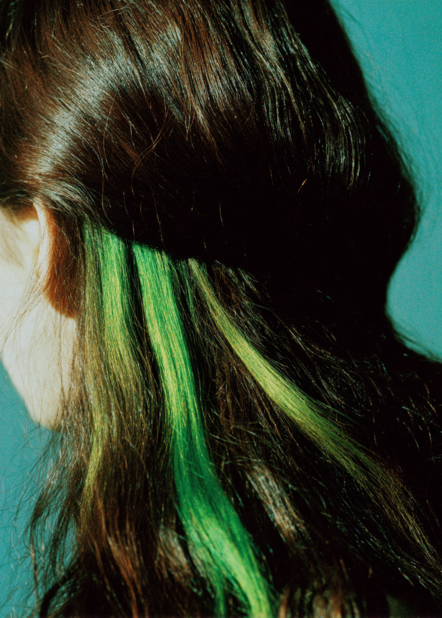 Vibrant green highlights accentuate long brown hair in this close-up image, highlighting the contrast and texture of the hairstyle.