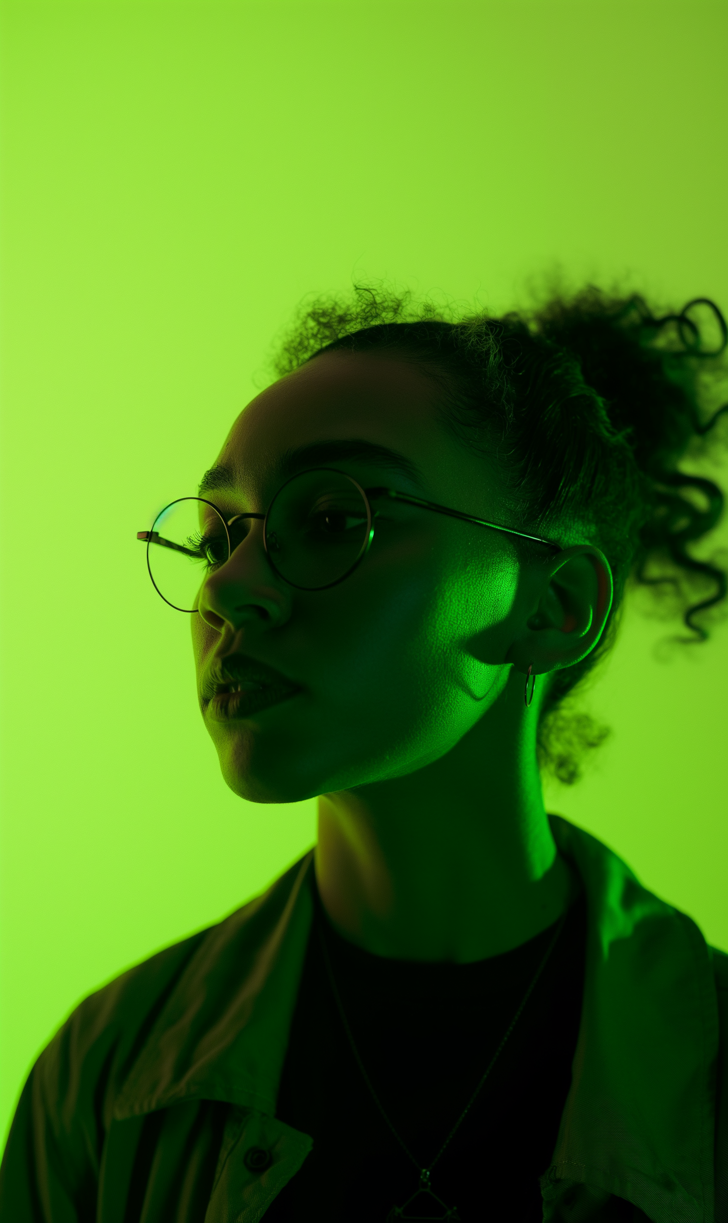 Side profile of a young woman with glasses against a green background, featuring dramatic lighting and a contemplative expression.