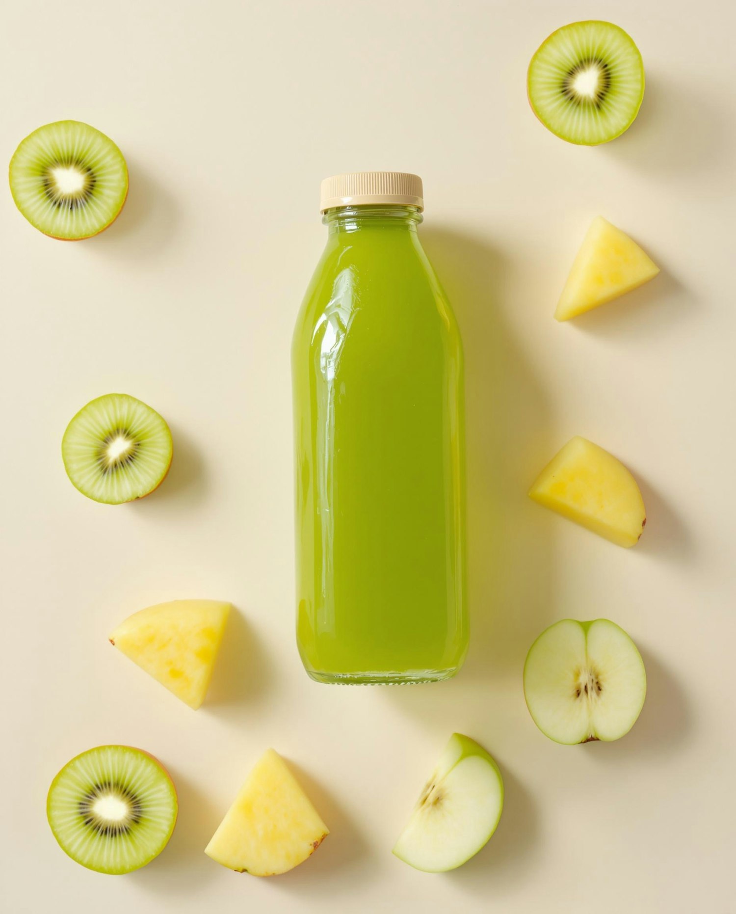 studio photography of a glass juice bottle with a beige cap, placed upright on a pale neutral background, surrounded by neatly arranged and halved fresh fruits, strong natural lighting with soft shadows, clean and aesthetic flat lay composition, minimal yet vibrant look, containing a bright green juice, surrounded by halved kiwis, small pineapple wedges, and green apple slices to enrich the composition