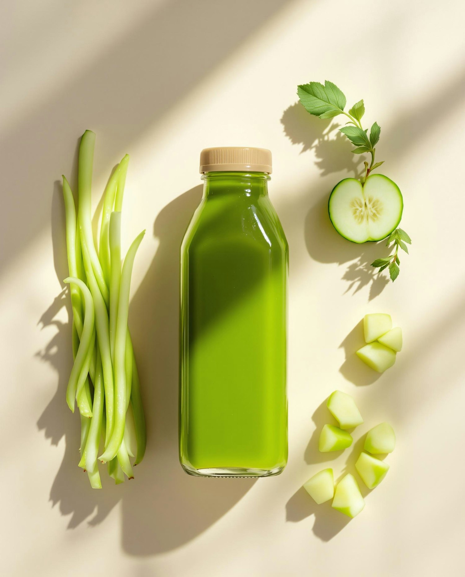 A bottle of green juice surrounded by fresh celery, cucumber slices, and leaves on a light background with soft natural lighting.