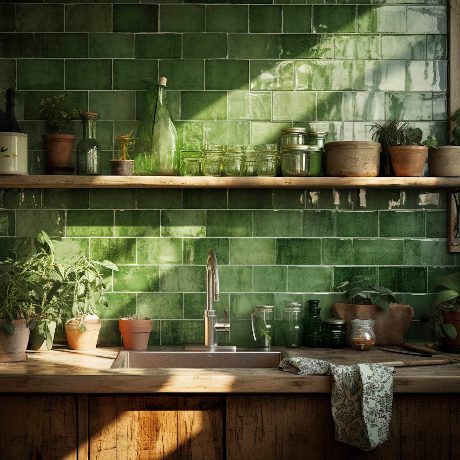 Rustic kitchen with green tile backsplash, wooden shelves, and potted plants. Sunlight creates a warm, inviting atmosphere.
