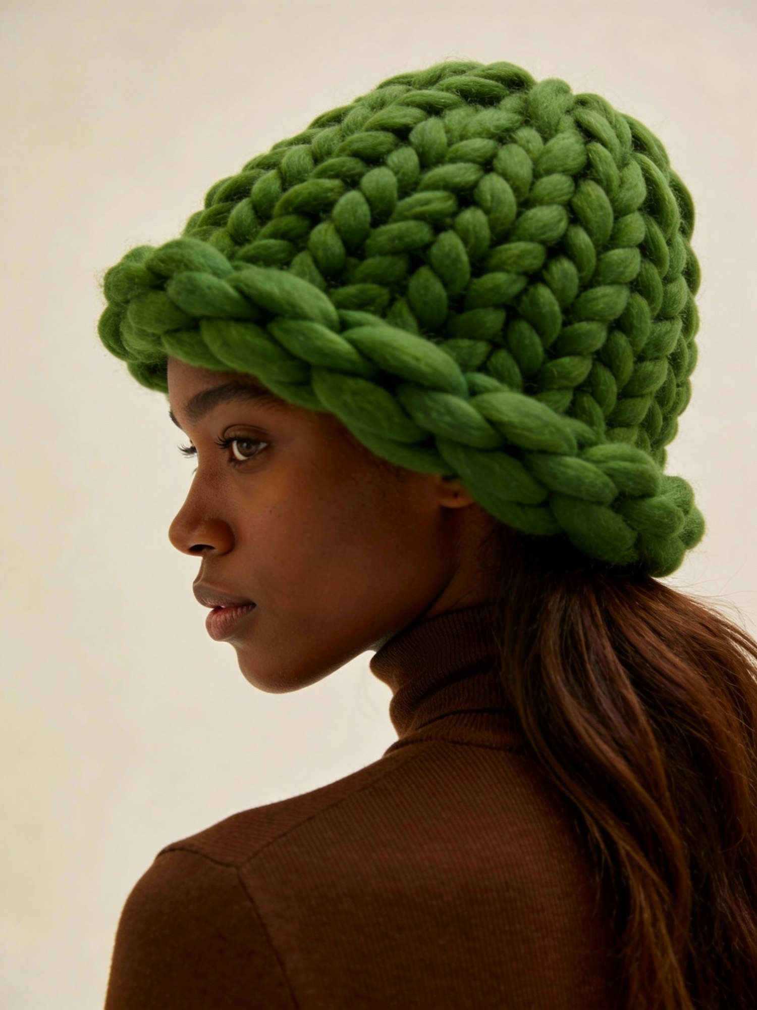 A fashion editorial portrait of a Black woman viewed from behind, wearing a thick, chunky-knit green beanie made of oversized yarn loops. Her long brown hair flows gently beneath the hat. She turns slightly to reveal a serene expression—soft eyes, relaxed features, and a peaceful gaze—captured in a quiet moment of winter calm and wears a brown turle neck. The background is plain and light-colored, emphasizing the bold texture and vibrant green color of the beanie. The lighting is soft and ambient, highlighting the cozy knit and the tranquil mood. The overall atmosphere is warm, introspective, and fashion-forward—blending tactile richness with emotional stillness in a minimalist setting.