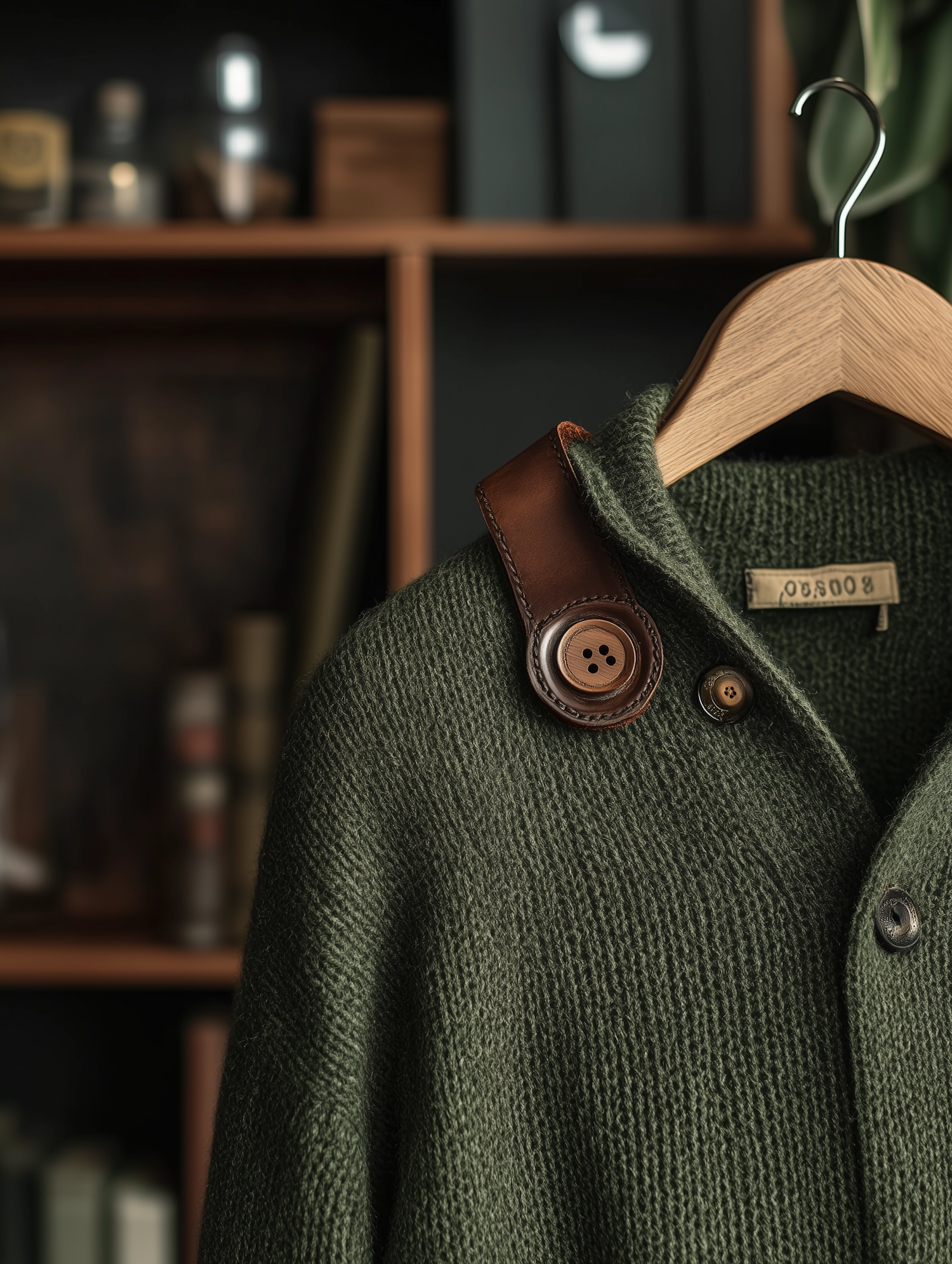 Close-up of a green knitted sweater with leather button detail, hanging on a wooden hanger against a rustic blurred shelf background.