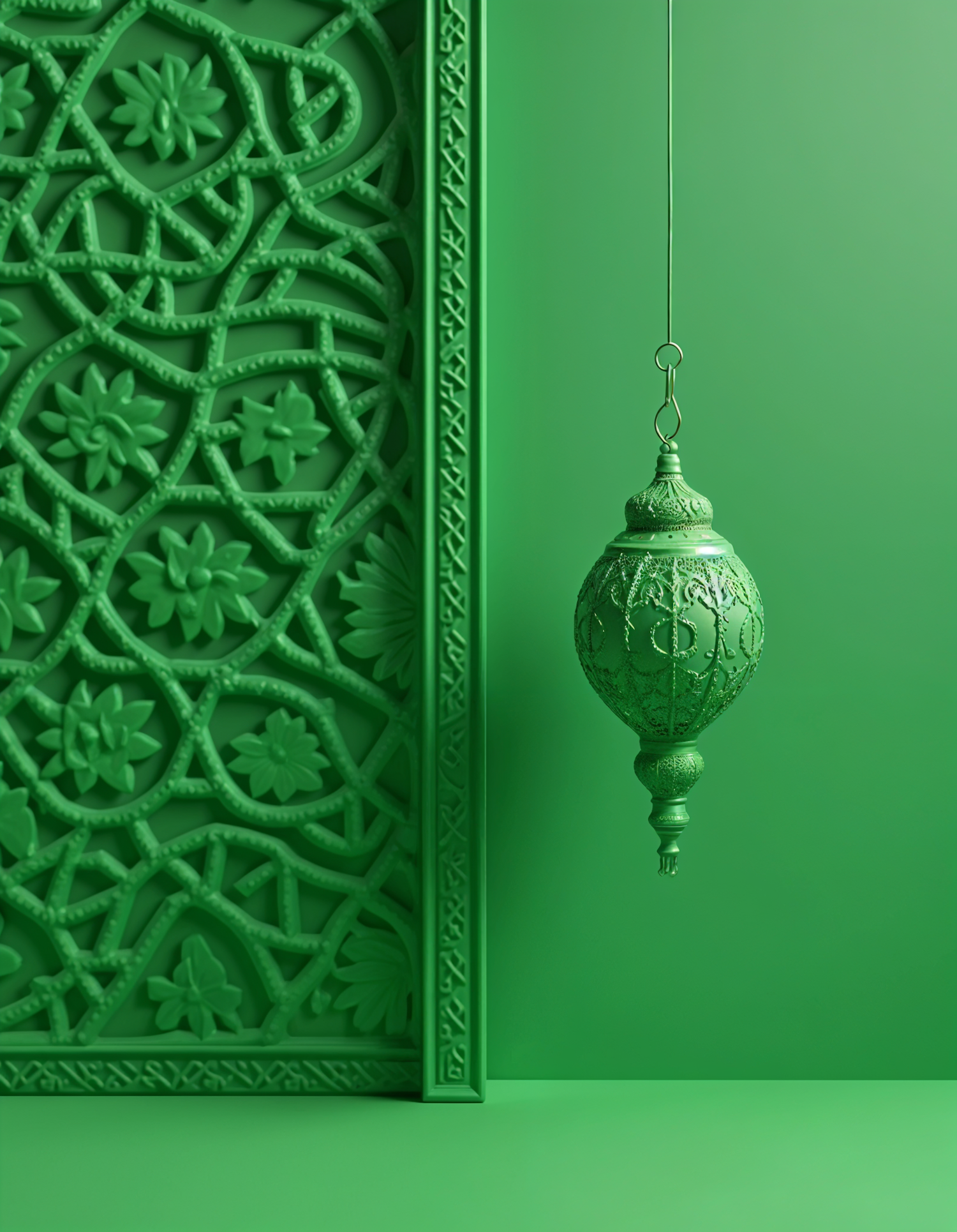 Intricate green lantern and floral-patterned panel in a monochromatic setting, showcasing elegant craftsmanship and design.
