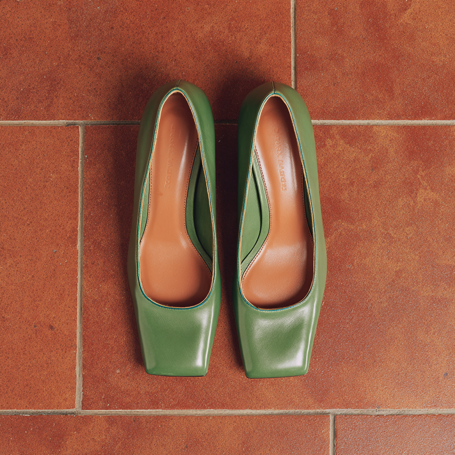 Stylish green square-toe shoes with a glossy finish, displayed on a terracotta tiled floor for a chic and modern aesthetic.